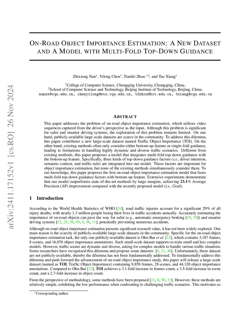 This paper addresses the problem of on-road object importance estimation, which utilizes video sequences captured from the driver's perspective as the input. Although this problem is significant for safer and smarter driving systems, the exploration of this problem remains limited. On one hand, publicly-available large-scale datasets are scarce in the community. To address this dilemma, this paper contributes a new large-scale dataset named Traffic Object Importance (TOI). On the other hand, existing methods often only consider either bottom-up feature or single-fold guidance, leading to limitations in handling highly dynamic and diverse traffic scenarios. Different from existing methods, this paper proposes a model that integrates multi-fold top-down guidance with the bottom-up feature. Specifically, three kinds of top-down guidance factors (ie, driver intention, semantic context, and traffic rule) are integrated into our model. These factors are important for object importance estimation, but none of the existing methods simultaneously consider them. To our knowledge, this paper proposes the first on-road object importance estimation model that fuses multi-fold top-down guidance factors with bottom-up feature. Extensive experiments demonstrate that our model outperforms state-of-the-art methods by large margins, achieving 23.1% Average Precision (AP) improvement compared with the recently proposed model (ie, Goal).