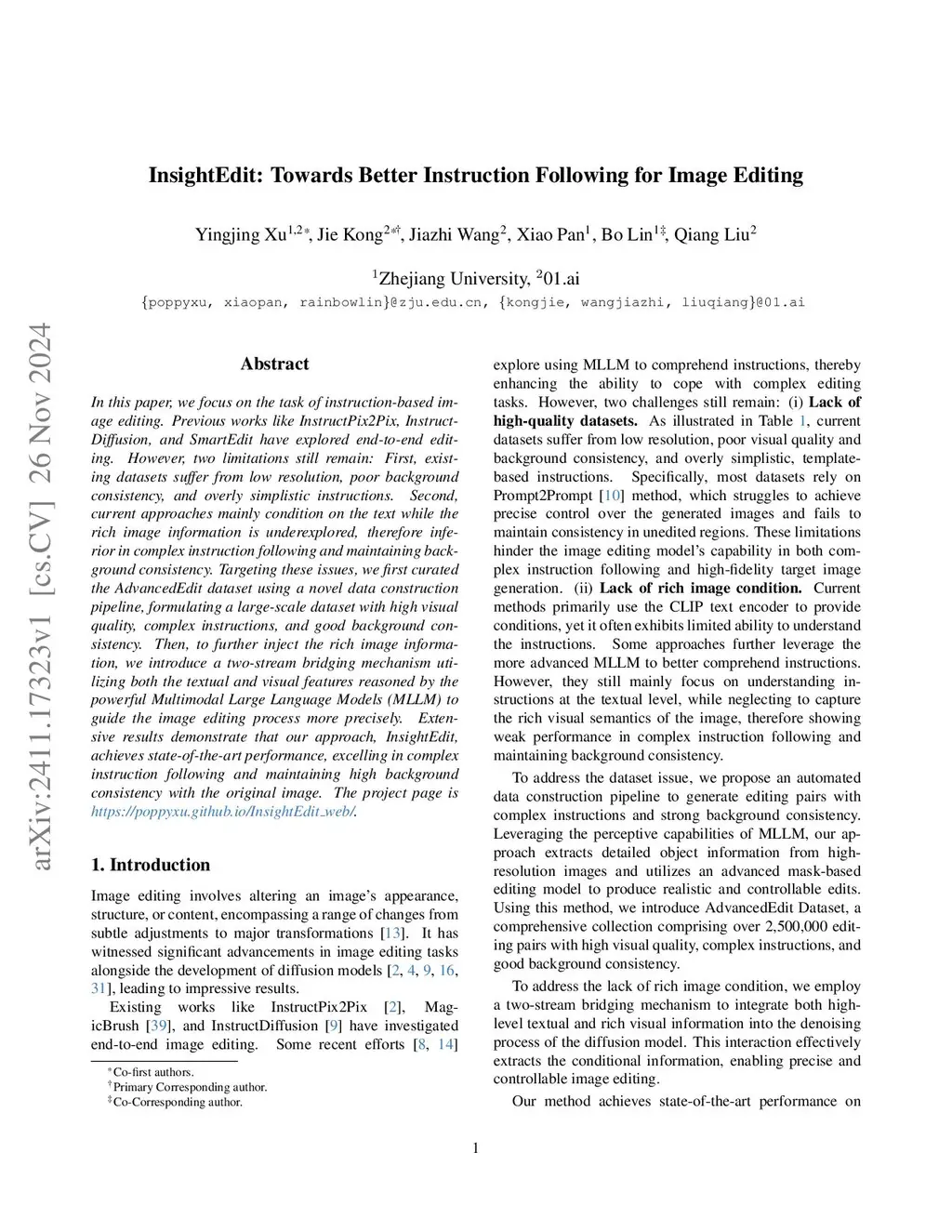 In this paper, we focus on the task of instruction-based image editing. Previous works like InstructPix2Pix, InstructDiffusion, and SmartEdit have explored end-to-end editing. However, two limitations still remain: First, existing datasets suffer from low resolution, poor background consistency, and overly simplistic instructions. Second, current approaches mainly condition on the text while the rich image information is underexplored, therefore inferior in complex instruction following and maintaining background consistency. Targeting these issues, we first curated the AdvancedEdit dataset using a novel data construction pipeline, formulating a large-scale dataset with high visual quality, complex instructions, and good background consistency. Then, to further inject the rich image information, we introduce a two-stream bridging mechanism utilizing both the textual and visual features reasoned by the powerful Multimodal Large Language Models (MLLM) to guide the image editing process more precisely. Extensive results demonstrate that our approach, InsightEdit, achieves state-of-the-art performance, excelling in complex instruction following and maintaining high background consistency with the original image.