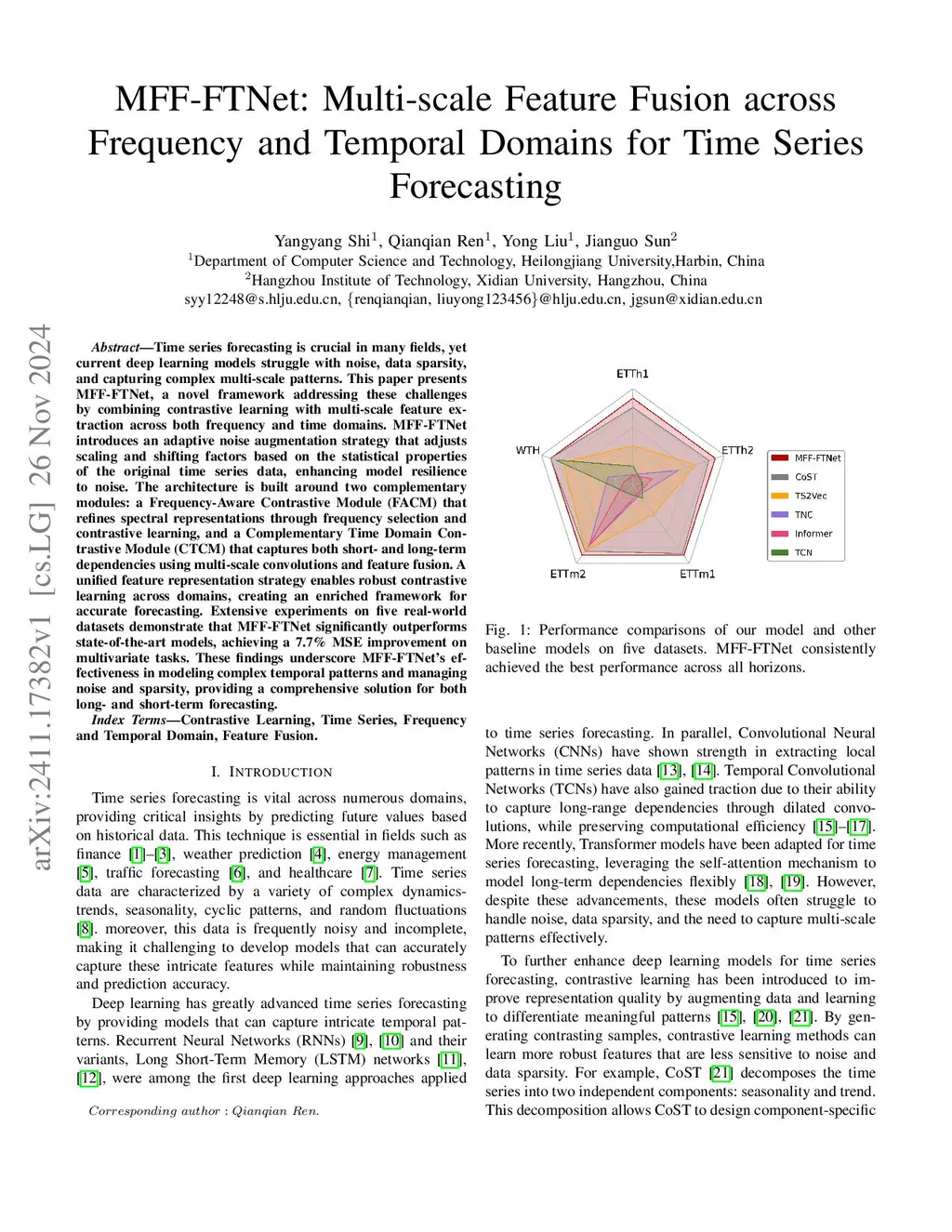 Time series forecasting is crucial in many fields, yet current deep learning models struggle with noise, data sparsity, and capturing complex multi-scale patterns. This paper presents MFF-FTNet, a novel framework addressing these challenges by combining contrastive learning with multi-scale feature extraction across both frequency and time domains. MFF-FTNet introduces an adaptive noise augmentation strategy that adjusts scaling and shifting factors based on the statistical properties of the original time series data, enhancing model resilience to noise. The architecture is built around two complementary modules: a Frequency-Aware Contrastive Module (FACM) that refines spectral representations through frequency selection and contrastive learning, and a Complementary Time Domain Contrastive Module (CTCM) that captures both short- and long-term dependencies using multi-scale convolutions and feature fusion. A unified feature representation strategy enables robust contrastive learning across domains, creating an enriched framework for accurate forecasting. Extensive experiments on five real-world datasets demonstrate that MFF-FTNet significantly outperforms state-of-the-art models, achieving a 7.7% MSE improvement on multivariate tasks. These findings underscore MFF-FTNet's effectiveness in modeling complex temporal patterns and managing noise and sparsity, providing a comprehensive solution for both long- and short-term forecasting.