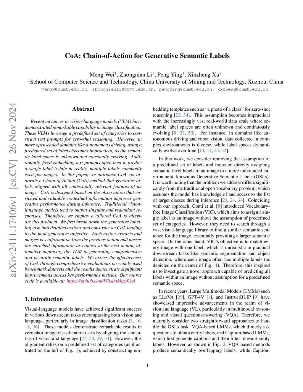 Recent advances in vision-language models (VLMs) have demonstrated remarkable capabilities in image classification by leveraging predefined sets of labels to construct text prompts for zero-shot reasoning. However, these approaches face significant limitations in undefined domains, where the label space is vocabulary-unknown and composite. We thus introduce Generative Semantic Labels (GSLs), a novel task that aims to predict a comprehensive set of semantic labels for an image without being constrained by a predefined labels set. Unlike traditional zero-shot classification, GSLs generates multiple semantic-level labels, encompassing objects, scenes, attributes, and relationships, thereby providing a richer and more accurate representation of image content. In this paper, we propose Chain-of-Action (CoA), an innovative method designed to tackle the GSLs task. CoA is motivated by the observation that enriched contextual information significantly improves generative performance during inference. Specifically, CoA decomposes the GSLs task into a sequence of detailed actions. Each action extracts and merges key information from the previous step, passing enriched context to the next, ultimately guiding the VLM to generate comprehensive and accurate semantic labels. We evaluate the effectiveness of CoA through extensive experiments on widely-used benchmark datasets. The results demonstrate significant improvements across key performance metrics, validating the capability of CoA to generate accurate and contextually rich semantic labels. Our work not only advances the state-of-the-art in generative semantic labels but also opens new avenues for applying VLMs in open-ended and dynamic real-world scenarios.