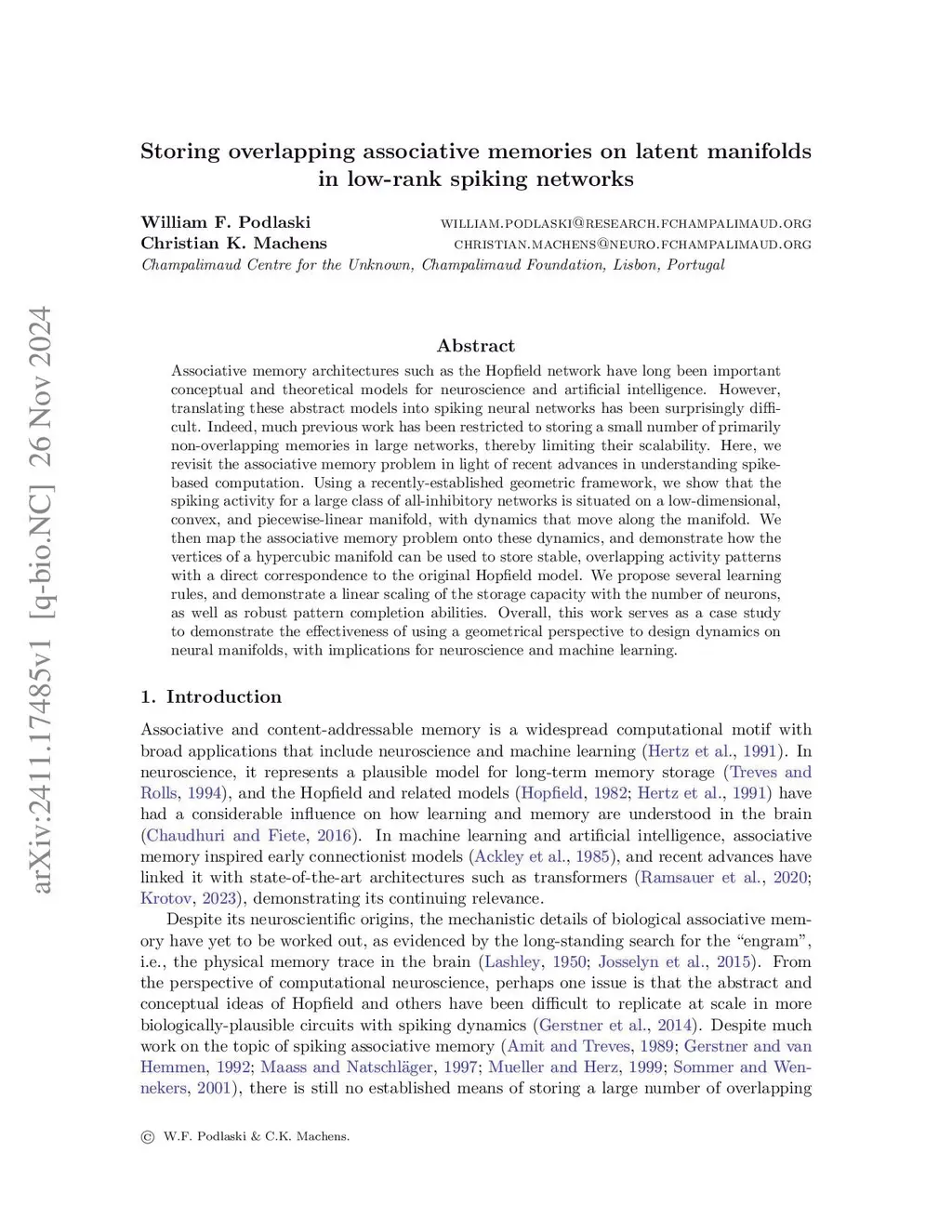 Storing overlapping associative memories on latent manifolds in low-rank spiking networks