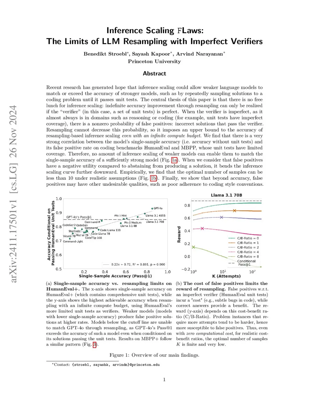 Recent research has generated hope that inference scaling could allow weaker language models to match or exceed the accuracy of stronger models, such as by repeatedly sampling solutions to a coding problem until it passes unit tests. The central thesis of this paper is that there is no free lunch for inference scaling: indefinite accuracy improvement through resampling can only be realized if the "verifier" (in this case, a set of unit tests) is perfect. When the verifier is imperfect, as it almost always is in domains such as reasoning or coding (for example, unit tests have imperfect coverage), there is a nonzero probability of false positives: incorrect solutions that pass the verifier. Resampling cannot decrease this probability, so it imposes an upper bound to the accuracy of resampling-based inference scaling even with an infinite compute budget. We find that there is a very strong correlation between the model's single-sample accuracy (i.e. accuracy without unit tests) and its false positive rate on coding benchmarks HumanEval and MBPP, whose unit tests have limited coverage. Therefore, no amount of inference scaling of weaker models can enable them to match the single-sample accuracy of a sufficiently strong model (Fig. 1a). When we consider that false positives have a negative utility compared to abstaining from producing a solution, it bends the inference scaling curve further downward. Empirically, we find that the optimal number of samples can be less than 10 under realistic assumptions (Fig. 1b). Finally, we show that beyond accuracy, false positives may have other undesirable qualities, such as poor adherence to coding style conventions.