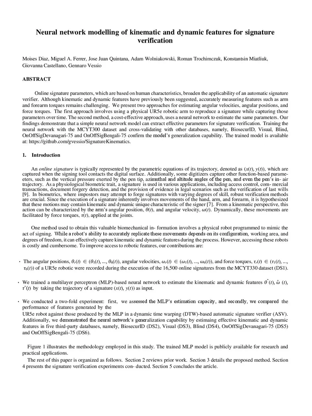 Neural network modelling of kinematic and dynamic features for signature