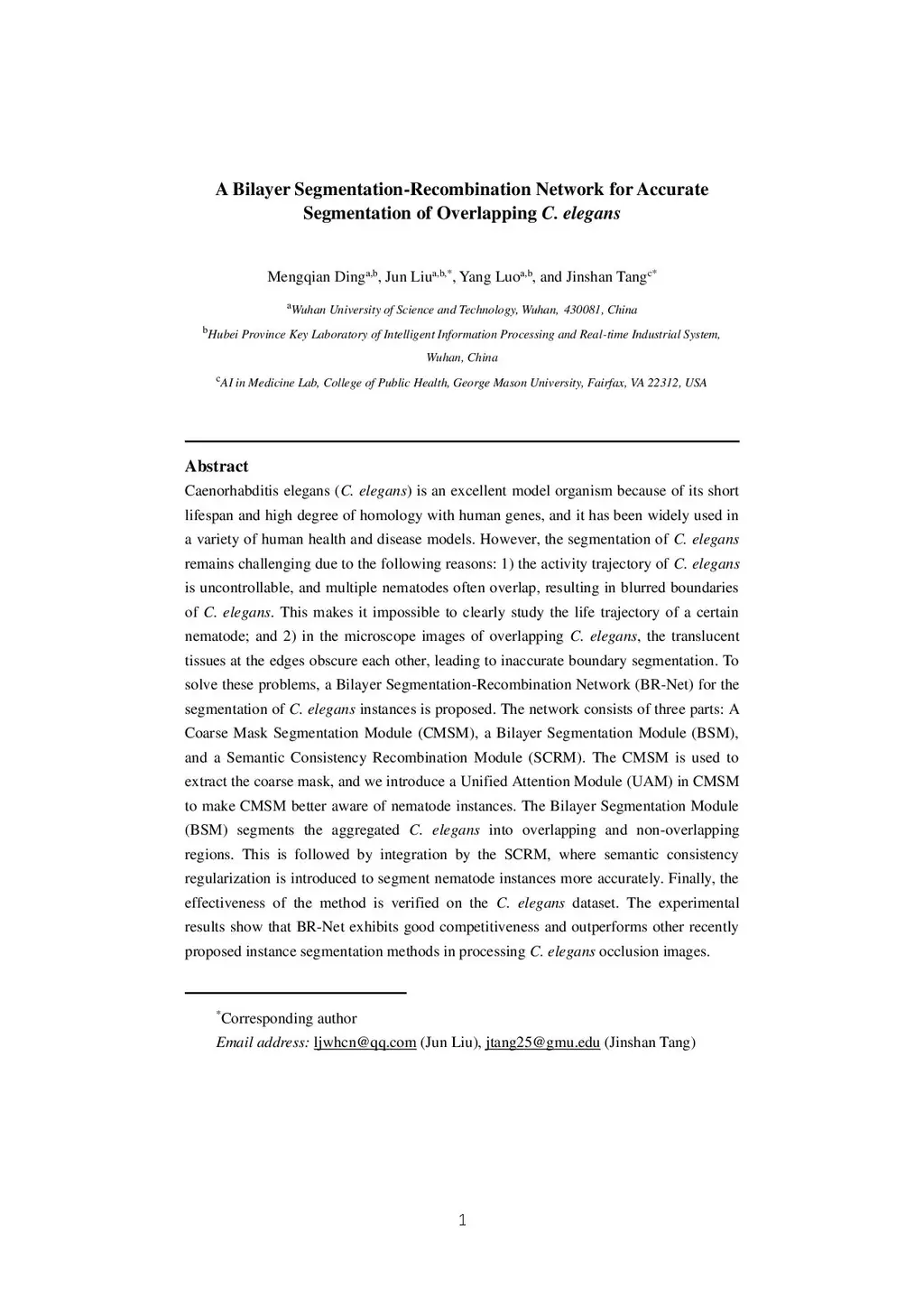 Caenorhabditis elegans (C. elegans) is an excellent model organism because of its short lifespan and high degree of homology with human genes, and it has been widely used in a variety of human health and disease models. However, the segmentation of C. elegans remains challenging due to the following reasons: 1) the activity trajectory of C. elegans is uncontrollable, and multiple nematodes often overlap, resulting in blurred boundaries of C. elegans. This makes it impossible to clearly study the life trajectory of a certain nematode; and 2) in the microscope images of overlapping C. elegans, the translucent tissues at the edges obscure each other, leading to inaccurate boundary segmentation. To solve these problems, a Bilayer Segmentation-Recombination Network (BR-Net) for the segmentation of C. elegans instances is proposed. The network consists of three parts: A Coarse Mask Segmentation Module (CMSM), a Bilayer Segmentation Module (BSM), and a Semantic Consistency Recombination Module (SCRM). The CMSM is used to extract the coarse mask, and we introduce a Unified Attention Module (UAM) in CMSM to make CMSM better aware of nematode instances. The Bilayer Segmentation Module (BSM) segments the aggregated C. elegans into overlapping and non-overlapping regions. This is followed by integration by the SCRM, where semantic consistency regularization is introduced to segment nematode instances more accurately. Finally, the effectiveness of the method is verified on the C. elegans dataset. The experimental results show that BR-Net exhibits good competitiveness and outperforms other recently proposed instance segmentation methods in processing C. elegans occlusion images.