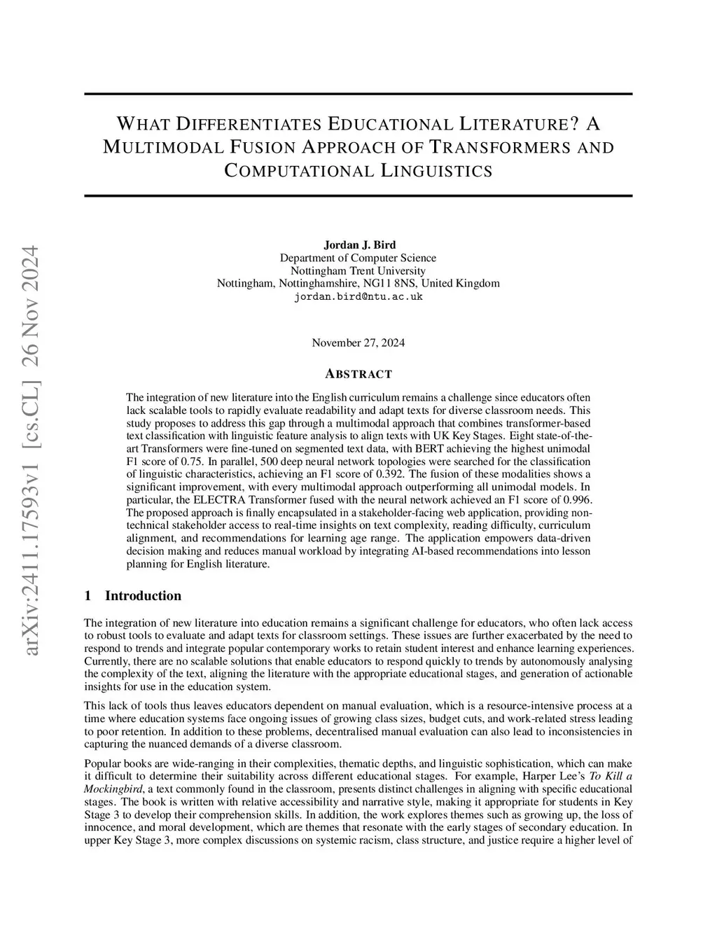 The integration of new literature into the English curriculum remains a challenge since educators often lack scalable tools to rapidly evaluate readability and adapt texts for diverse classroom needs. This study proposes to address this gap through a multimodal approach that combines transformer-based text classification with linguistic feature analysis to align texts with UK Key Stages. Eight state-of-the-art Transformers were fine-tuned on segmented text data, with BERT achieving the highest unimodal F1 score of 0.75. In parallel, 500 deep neural network topologies were searched for the classification of linguistic characteristics, achieving an F1 score of 0.392. The fusion of these modalities shows a significant improvement, with every multimodal approach outperforming all unimodal models. In particular, the ELECTRA Transformer fused with the neural network achieved an F1 score of 0.996. Unimodal and multimodal approaches are shown to have statistically significant differences in all validation metrics (accuracy, precision, recall, F1 score) except for inference time. The proposed approach is finally encapsulated in a stakeholder-facing web application, providing non-technical stakeholder access to real-time insights on text complexity, reading difficulty, curriculum alignment, and recommendations for learning age range. The application empowers data-driven decision making and reduces manual workload by integrating AI-based recommendations into lesson planning for English literature.