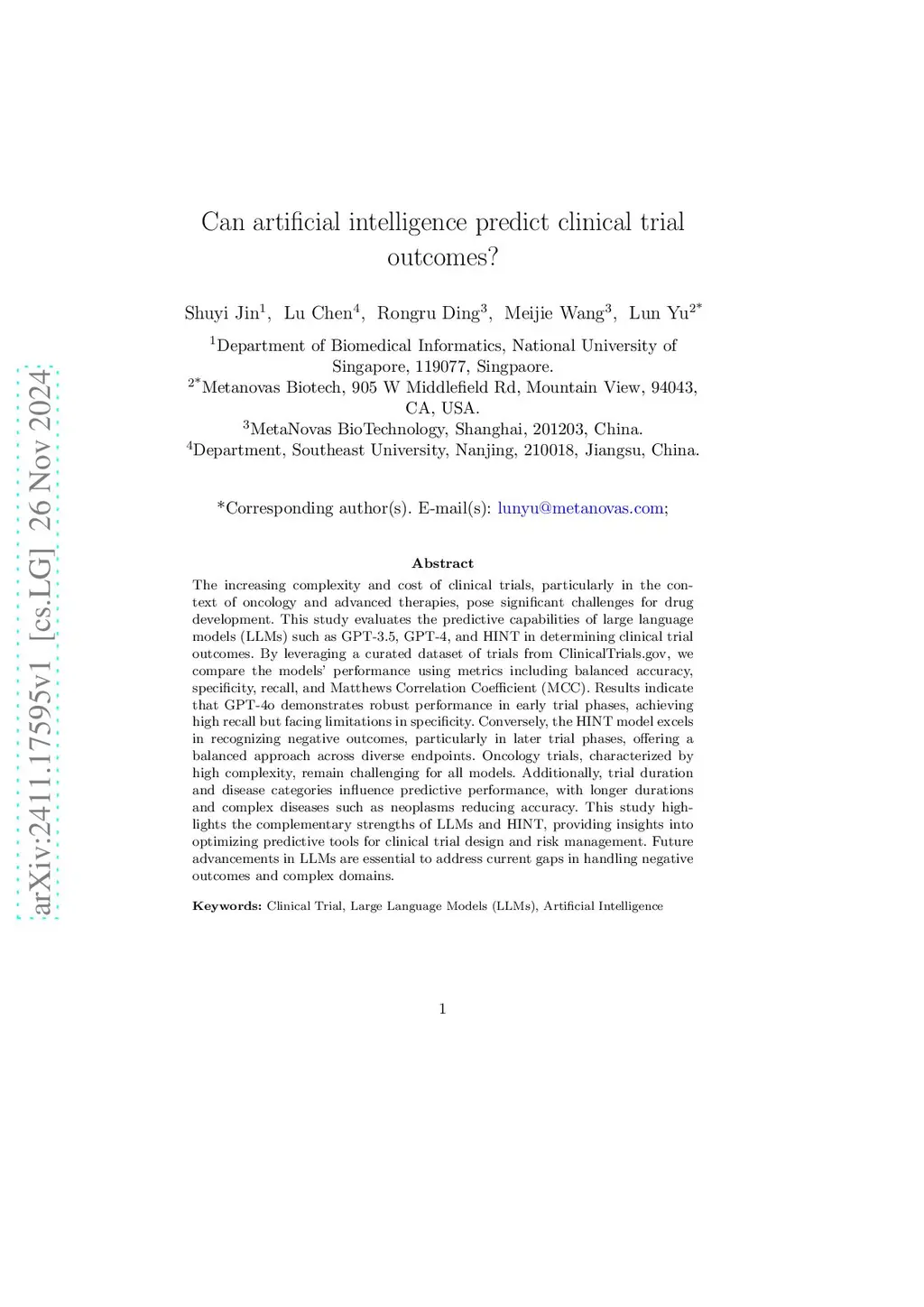 This study evaluates the performance of large language models (LLMs) and the HINT model in predicting clinical trial outcomes, focusing on metrics including Balanced Accuracy, Matthews Correlation Coefficient (MCC), Recall, and Specificity. Results show that GPT-4o achieves superior overall performance among LLMs but, like its counterparts (GPT-3.5, GPT-4mini, Llama3), struggles with identifying negative outcomes. In contrast, HINT excels in negative sample recognition and demonstrates resilience to external factors (e.g., recruitment challenges) but underperforms in oncology trials, a major component of the dataset. LLMs exhibit strengths in early-phase trials and simpler endpoints like Overall Survival (OS), while HINT shows consistency across trial phases and excels in complex endpoints (e.g., Objective Response Rate). Trial duration analysis reveals improved model performance for medium- to long-term trials, with GPT-4o and HINT displaying stability and enhanced specificity, respectively. We underscore the complementary potential of LLMs (e.g., GPT-4o, Llama3) and HINT, advocating for hybrid approaches to leverage GPT-4o's predictive power and HINT's specificity in clinical trial outcome forecasting.