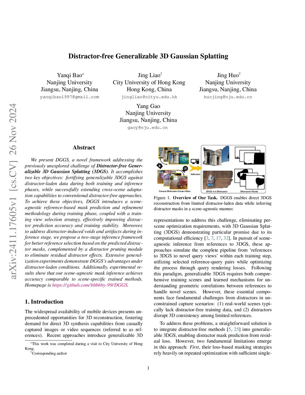 We present DGGS, a novel framework that addresses the previously unexplored challenge: (3DGS). It mitigates 3D inconsistency and training instability caused by distractor data in the cross-scenes generalizable train setting while enabling feedforward inference for 3DGS and distractor masks from references in the unseen scenes. To achieve these objectives, DGGS proposes a scene-agnostic reference-based mask prediction and refinement module during the training phase, effectively eliminating the impact of distractor on training stability. Moreover, we combat distractor-induced artifacts and holes at inference time through a novel two-stage inference framework for references scoring and re-selection, complemented by a distractor pruning mechanism that further removes residual distractor 3DGS-primitive influences. Extensive feedforward experiments on the real and our synthetic data show DGGS's reconstruction capability when dealing with novel distractor scenes. Moreover, our generalizable mask prediction even achieves an accuracy superior to existing scene-specific training methods. Homepage isthis https URL.