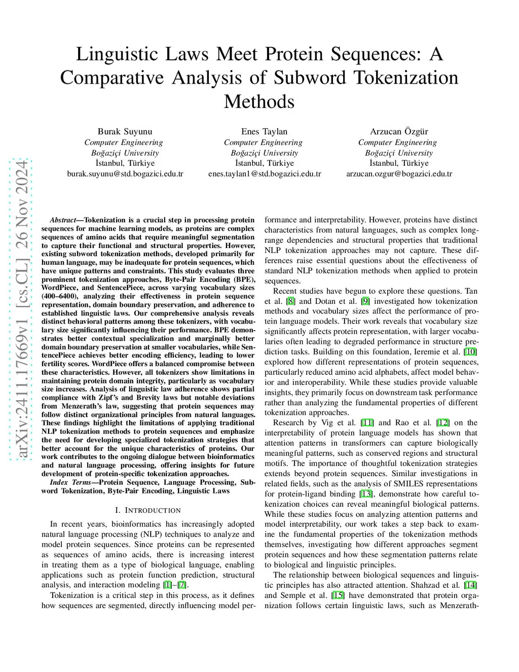 Tokenization is a crucial step in processing protein sequences for machine learning models, as proteins are complex sequences of amino acids that require meaningful segmentation to capture their functional and structural properties. However, existing subword tokenization methods, developed primarily for human language, may be inadequate for protein sequences, which have unique patterns and constraints. This study evaluates three prominent tokenization approaches, Byte-Pair Encoding (BPE), WordPiece, and SentencePiece, across varying vocabulary sizes (400-6400), analyzing their effectiveness in protein sequence representation, domain boundary preservation, and adherence to established linguistic laws. Our comprehensive analysis reveals distinct behavioral patterns among these tokenizers, with vocabulary size significantly influencing their performance. BPE demonstrates better contextual specialization and marginally better domain boundary preservation at smaller vocabularies, while SentencePiece achieves better encoding efficiency, leading to lower fertility scores. WordPiece offers a balanced compromise between these characteristics. However, all tokenizers show limitations in maintaining protein domain integrity, particularly as vocabulary size increases. Analysis of linguistic law adherence shows partial compliance with Zipf's and Brevity laws but notable deviations from Menzerath's law, suggesting that protein sequences may follow distinct organizational principles from natural languages. These findings highlight the limitations of applying traditional NLP tokenization methods to protein sequences and emphasize the need for developing specialized tokenization strategies that better account for the unique characteristics of proteins.