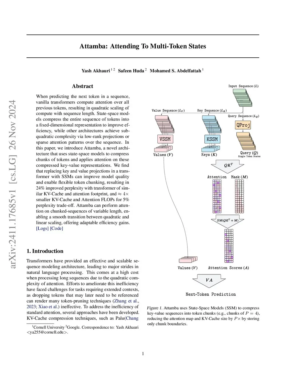 When predicting the next token in a sequence, vanilla transformers compute attention over all previous tokens, resulting in quadratic scaling of compute with sequence length. State-space models compress the entire sequence of tokens into a fixed-dimensional representation to improve efficiency, while other architectures achieve sub-quadratic complexity via low-rank projections or sparse attention patterns over the sequence. In this paper, we introduce Attamba, a novel architecture that uses state-space models to compress chunks of tokens and applies attention on these compressed key-value representations. We find that replacing key and value projections in a transformer with SSMs can improve model quality and enable flexible token chunking, resulting in 24% improved perplexity with transformer of similar KV-Cache and attention footprint, and ~4 times smaller KV-Cache and Attention FLOPs for 5% perplexity trade-off. Attamba can perform attention on chunked-sequences of variable length, enabling a smooth transition between quadratic and linear scaling, offering adaptable efficiency gains.