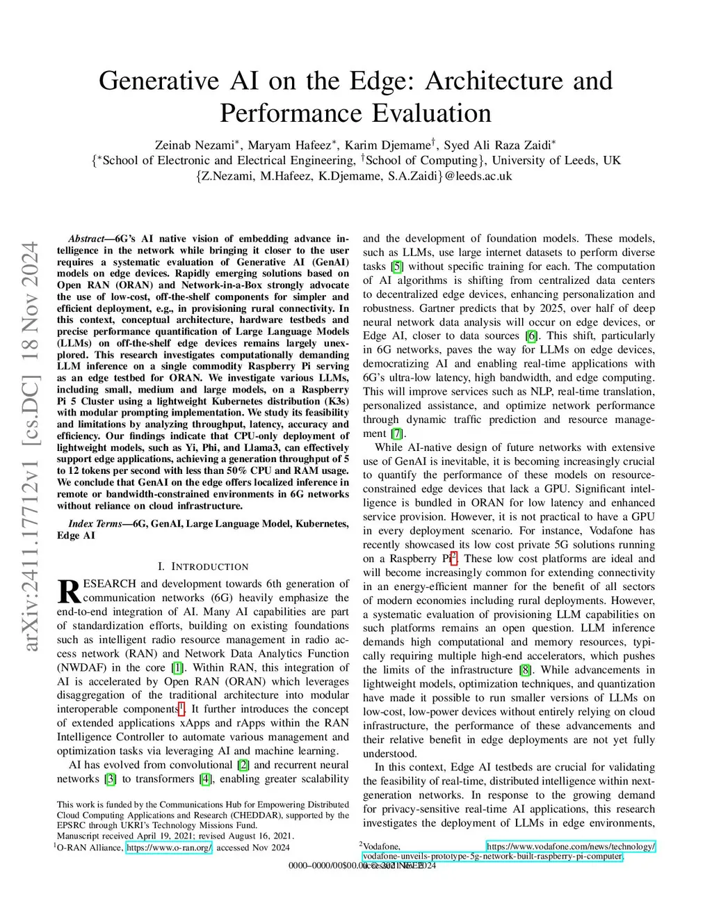 6G's AI native vision of embedding advance intelligence in the network while bringing it closer to the user requires a systematic evaluation of Generative AI (GenAI) models on edge devices. Rapidly emerging solutions based on Open RAN (ORAN) and Network-in-a-Box strongly advocate the use of low-cost, off-the-shelf components for simpler and efficient deployment, e.g., in provisioning rural connectivity. In this context, conceptual architecture, hardware testbeds and precise performance quantification of Large Language Models (LLMs) on off-the-shelf edge devices remains largely unexplored. This research investigates computationally demanding LLM inference on a single commodity Raspberry Pi serving as an edge testbed for ORAN. We investigate various LLMs, including small, medium and large models, on a Raspberry Pi 5 Cluster using a lightweight Kubernetes distribution (K3s) with modular prompting implementation. We study its feasibility and limitations by analyzing throughput, latency, accuracy and efficiency. Our findings indicate that CPU-only deployment of lightweight models, such as Yi, Phi, and Llama3, can effectively support edge applications, achieving a generation throughput of 5 to 12 tokens per second with less than 50\% CPU and RAM usage. We conclude that GenAI on the edge offers localized inference in remote or bandwidth-constrained environments in 6G networks without reliance on cloud infrastructure.