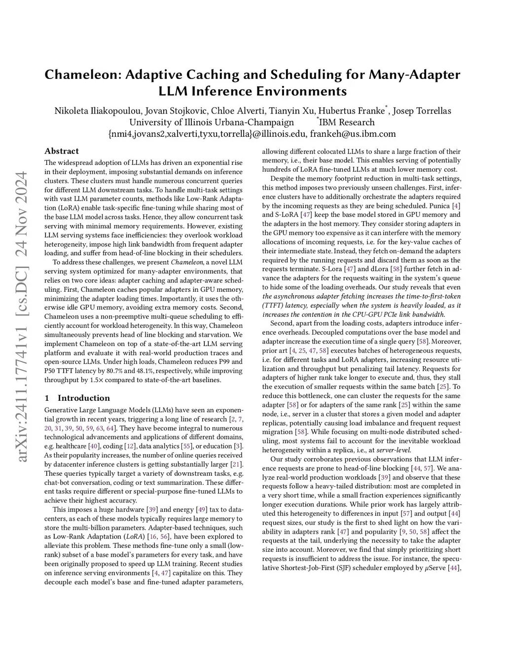 The widespread adoption of LLMs has driven an exponential rise in their deployment, imposing substantial demands on inference clusters. These clusters must handle numerous concurrent queries for different LLM downstream tasks. To handle multi-task settings with vast LLM parameter counts, methods like Low-Rank Adaptation (LoRA) enable task-specific fine-tuning while sharing most of the base LLM model across tasks. Hence, they allow concurrent task serving with minimal memory requirements. However, existing LLM serving systems face inefficiencies: they overlook workload heterogeneity, impose high link bandwidth from frequent adapter loading, and suffer from head-of-line blocking in their schedulers. To address these challenges, we present Chameleon, a novel LLM serving system optimized for many adapter environments, that relies on two core ideas: adapter caching and adapter-aware scheduling. First, Chameleon caches popular adapters in GPU memory, minimizing the adapter loading times. Importantly, it uses the otherwise idle GPU memory, avoiding extra memory costs. Second, Chameleon uses a non-preemptive multi-queue scheduling to efficiently account for workload heterogeneity. In this way, Chameleon simultaneously prevents head of line blocking and starvation. We implement Chameleon on top of a state-of-the-art LLM serving platform and evaluate it with real-world production traces and open-source LLMs. Under high loads, Chameleon reduces P99 and P50 TTFT latency by 80.7% and 48.1%, respectively, while improving throughput by 1.5x compared to state-of-the-art baselines.
