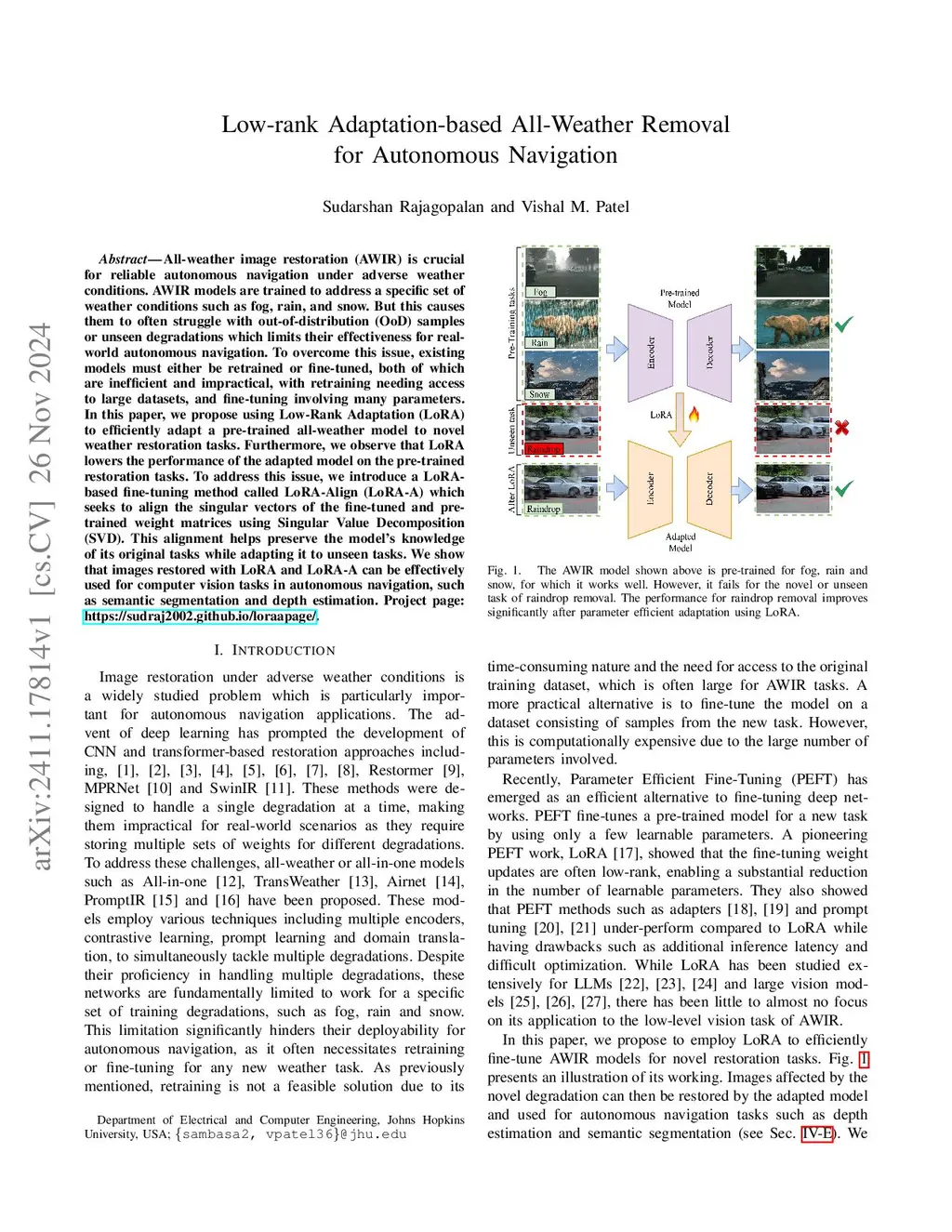 Low-rank Adaptation-based All-Weather Removal for Autonomous Navigation