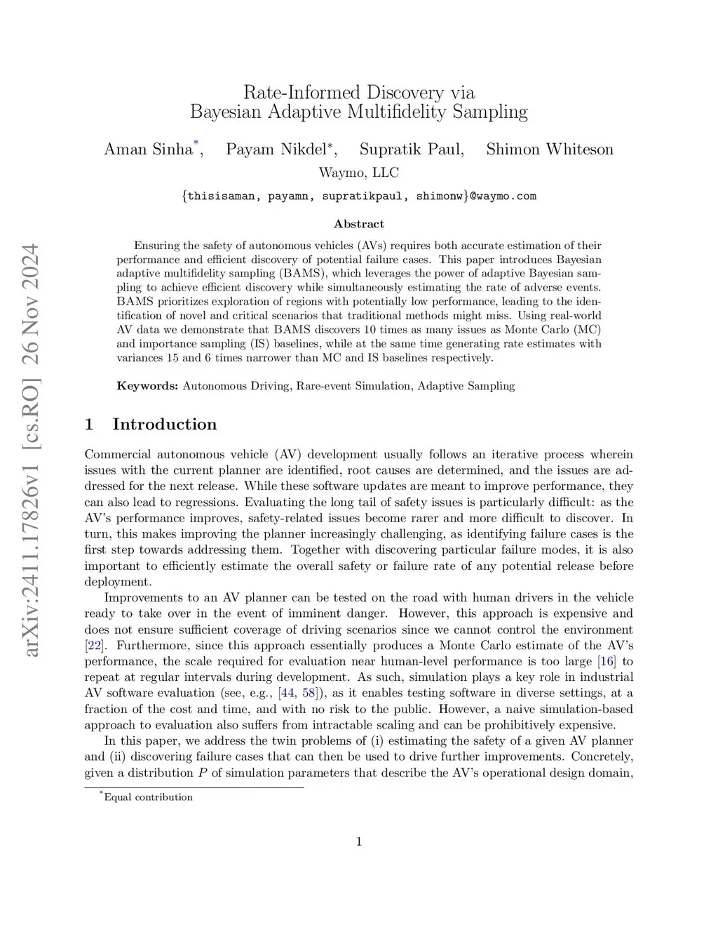 Ensuring the safety of autonomous vehicles (AVs) requires both accurate estimation of their performance and efficient discovery of potential failure cases. This paper introduces Bayesian adaptive multifidelity sampling (BAMS), which leverages the power of adaptive Bayesian sampling to achieve efficient discovery while simultaneously estimating the rate of adverse events. BAMS prioritizes exploration of regions with potentially low performance, leading to the identification of novel and critical scenarios that traditional methods might miss. Using real-world AV data we demonstrate that BAMS discovers 10 times as many issues as Monte Carlo (MC) and importance sampling (IS) baselines, while at the same time generating rate estimates with variances 15 and 6 times narrower than MC and IS baselines respectively.