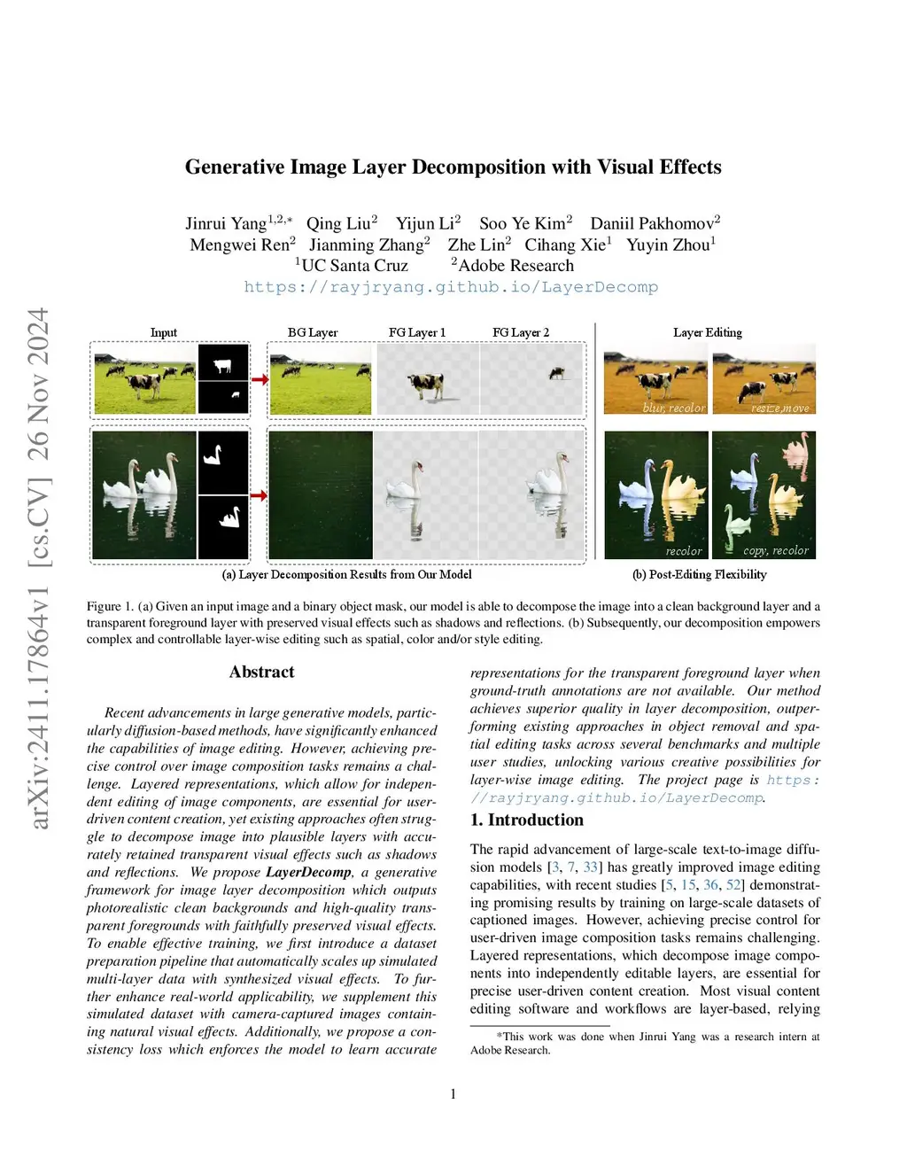 Recent advancements in large generative models, particularly diffusion-based methods, have significantly enhanced the capabilities of image editing. However, achieving precise control over image composition tasks remains a challenge. Layered representations, which allow for independent editing of image components, are essential for user-driven content creation, yet existing approaches often struggle to decompose image into plausible layers with accurately retained transparent visual effects such as shadows and reflections. We propose , a generative framework for image layer decomposition which outputs photorealistic clean backgrounds and high-quality transparent foregrounds with faithfully preserved visual effects. To enable effective training, we first introduce a dataset preparation pipeline that automatically scales up simulated multi-layer data with synthesized visual effects. To further enhance real-world applicability, we supplement this simulated dataset with camera-captured images containing natural visual effects. Additionally, we propose a consistency loss which enforces the model to learn accurate representations for the transparent foreground layer when ground-truth annotations are not available. Our method achieves superior quality in layer decomposition, outperforming existing approaches in object removal and spatial editing tasks across several benchmarks and multiple user studies, unlocking various creative possibilities for layer-wise image editing. The project page is https://rayjryang.github.io/LayerDecomp.