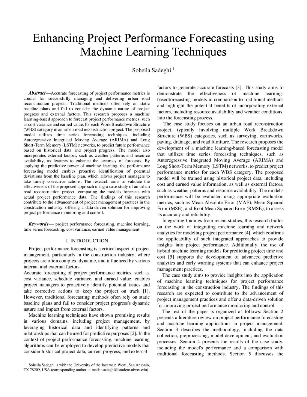 Accurate forecasting of project performance metrics is crucial for successfully managing and delivering urban road reconstruction projects. Traditional methods often rely on static baseline plans and fail to consider the dynamic nature of project progress and external factors. This research proposes a machine learning-based approach to forecast project performance metrics, such as cost variance and earned value, for each Work Breakdown Structure (WBS) category in an urban road reconstruction project. The proposed model utilizes time series forecasting techniques, including Autoregressive Integrated Moving Average (ARIMA) and Long Short-Term Memory (LSTM) networks, to predict future performance based on historical data and project progress. The model also incorporates external factors, such as weather patterns and resource availability, as features to enhance the accuracy of forecasts. By applying the predictive power of machine learning, the performance forecasting model enables proactive identification of potential deviations from the baseline plan, which allows project managers to take timely corrective actions. The research aims to validate the effectiveness of the proposed approach using a case study of an urban road reconstruction project, comparing the model's forecasts with actual project performance data. The findings of this research contribute to the advancement of project management practices in the construction industry, offering a data-driven solution for improving project performance monitoring and control.
