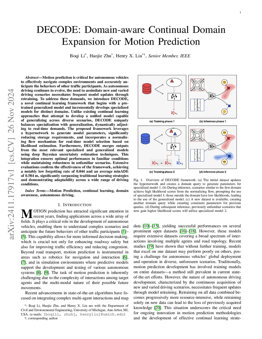 Motion prediction is critical for autonomous vehicles to effectively navigate complex environments and accurately anticipate the behaviors of other traffic participants. As autonomous driving continues to evolve, the need to assimilate new and varied driving scenarios necessitates frequent model updates through retraining. To address these demands, we introduce DECODE, a novel continual learning framework that begins with a pre-trained generalized model and incrementally develops specialized models for distinct domains. Unlike existing continual learning approaches that attempt to develop a unified model capable of generalizing across diverse scenarios, DECODE uniquely balances specialization with generalization, dynamically adjusting to real-time demands. The proposed framework leverages a hypernetwork to generate model parameters, significantly reducing storage requirements, and incorporates a normalizing flow mechanism for real-time model selection based on likelihood estimation. Furthermore, DECODE merges outputs from the most relevant specialized and generalized models using deep Bayesian uncertainty estimation techniques. This integration ensures optimal performance in familiar conditions while maintaining robustness in unfamiliar scenarios. Extensive evaluations confirm the effectiveness of the framework, achieving a notably low forgetting rate of 0.044 and an average minADE of 0.584 m, significantly surpassing traditional learning strategies and demonstrating adaptability across a wide range of driving conditions.