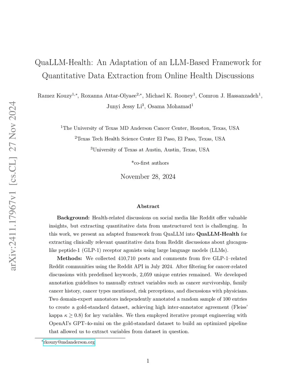 Health-related discussions on social media like Reddit offer valuable insights, but extracting quantitative data from unstructured text is challenging. In this work, we present an adapted framework from QuaLLM into QuaLLM-Health for extracting clinically relevant quantitative data from Reddit discussions about glucagon-like peptide-1 (GLP-1) receptor agonists using large language models (LLMs). We collected 410k posts and comments from five GLP-1-related communities using the Reddit API in July 2024. After filtering for cancer-related discussions, 2,059 unique entries remained. We developed annotation guidelines to manually extract variables such as cancer survivorship, family cancer history, cancer types mentioned, risk perceptions, and discussions with physicians. Two domain-experts independently annotated a random sample of 100 entries to create a gold-standard dataset. We then employed iterative prompt engineering with OpenAI's "GPT-4o-mini" on the gold-standard dataset to build an optimized pipeline that allowed us to extract variables from the large dataset. The optimized LLM achieved accuracies above 0.85 for all variables, with precision, recall and F1 score macro averaged > 0.90, indicating balanced performance. Stability testing showed a 95% match rate across runs, confirming consistency. Applying the framework to the full dataset enabled efficient extraction of variables necessary for downstream analysis, costing under $3 and completing in approximately one hour. QuaLLM-Health demonstrates that LLMs can effectively and efficiently extract clinically relevant quantitative data from unstructured social media content. Incorporating human expertise and iterative prompt refinement ensures accuracy and reliability. This methodology can be adapted for large-scale analysis of patient-generated data across various health domains, facilitating valuable insights for healthcare research.
