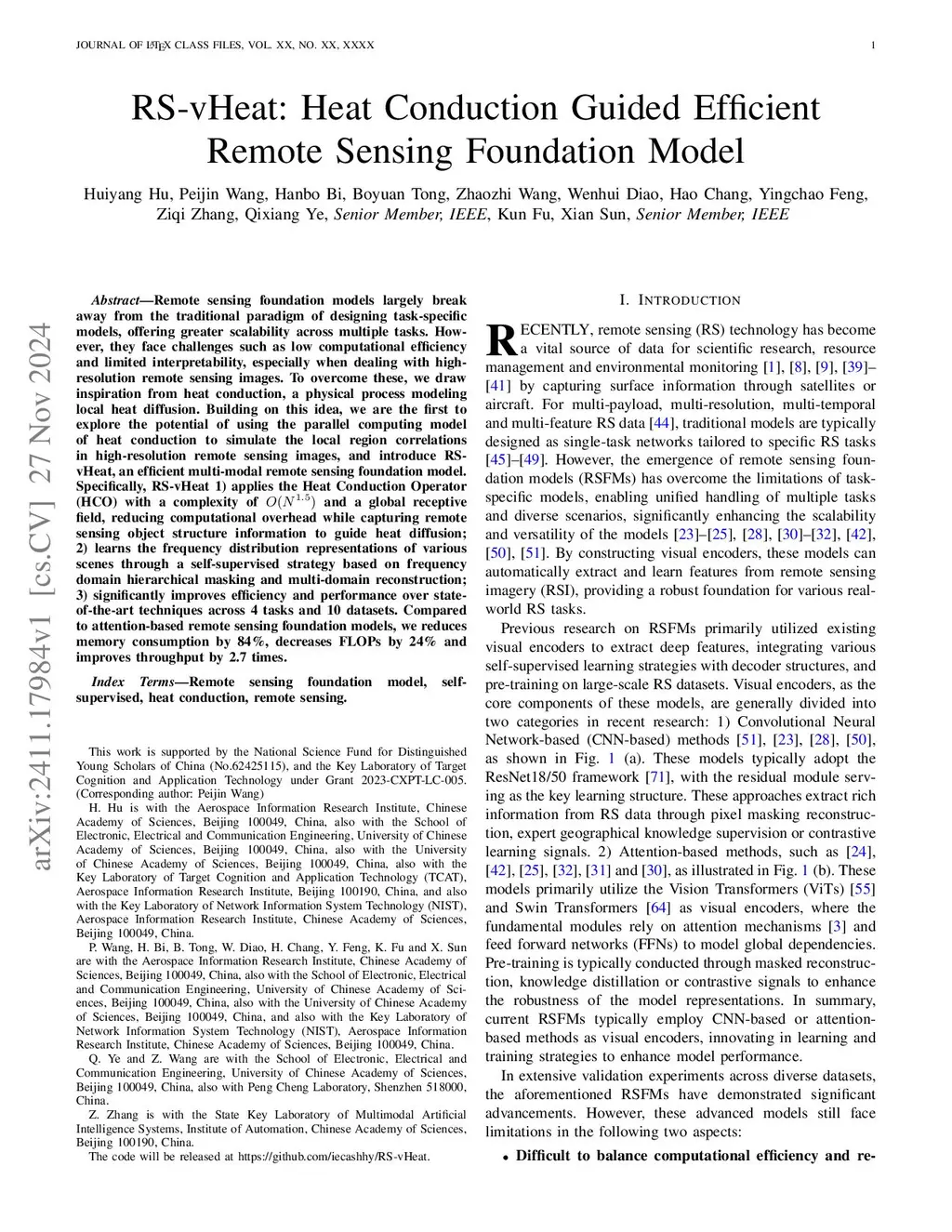 Remote sensing foundation models largely break away from the traditional paradigm of designing task-specific models, offering greater scalability across multiple tasks. However, they face challenges such as low computational efficiency and limited interpretability, especially when dealing with large-scale remote sensing images. To overcome these, we draw inspiration from heat conduction, a physical process modeling local heat diffusion. Building on this idea, we are the first to explore the potential of using the parallel computing model of heat conduction to simulate the local region correlations in high-resolution remote sensing images, and introduce RS-vHeat, an efficient multi-modal remote sensing foundation model. Specifically, RS-vHeat 1) applies the Heat Conduction Operator (HCO) with a complexity of and a global receptive field, reducing computational overhead while capturing remote sensing object structure information to guide heat diffusion; 2) learns the frequency distribution representations of various scenes through a self-supervised strategy based on frequency domain hierarchical masking and multi-domain reconstruction; 3) significantly improves efficiency and performance over state-of-the-art techniques across 4 tasks and 10 datasets. Compared to attention-based remote sensing foundation models, we reduce memory usage by 84\%, FLOPs by 24\% and improves throughput by 2.7 times. The code will be made publicly available.