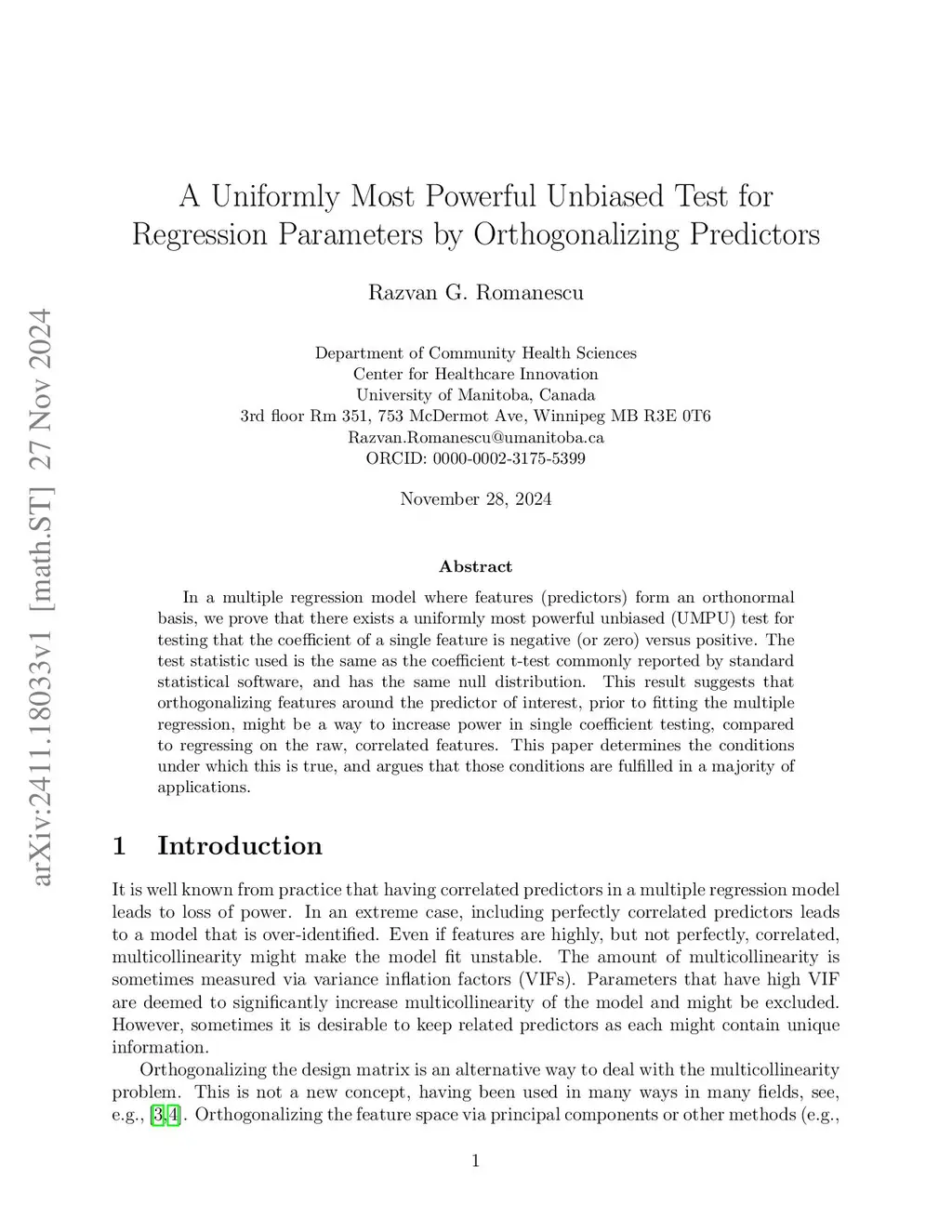 In a multiple regression model where features (predictors) form an orthonormal basis, we prove that there exists a uniformly most powerful unbiased (UMPU) test for testing that the coefficient of a single feature is negative (or zero) versus positive. The test statistic used is the same as the coefficient t-test commonly reported by standard statistical software, and has the same null distribution. This result suggests that orthogonalizing features around the predictor of interest, prior to fitting the multiple regression, might be a way to increase power in single coefficient testing, compared to regressing on the raw, correlated features. This paper determines the conditions under which this is true, and argues that those conditions are fulfilled in a majority of applications.