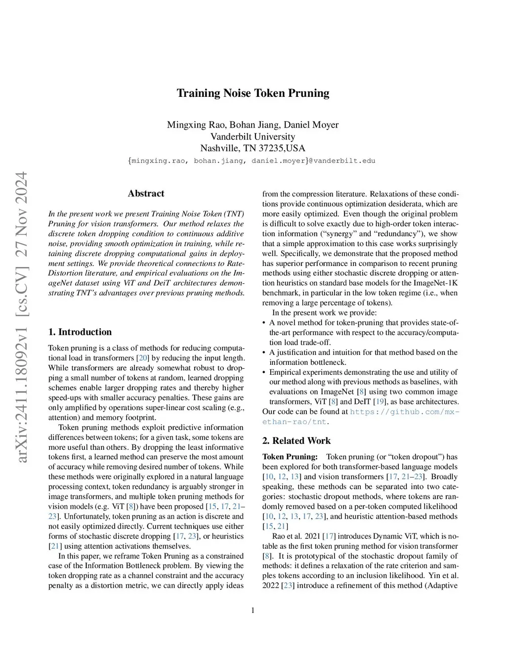 In the present work we present Training Noise Token (TNT) Pruning for vision transformers. Our method relaxes the discrete token dropping condition to continuous additive noise, providing smooth optimization in training, while retaining discrete dropping computational gains in deployment settings. We provide theoretical connections to Rate-Distortion literature, and empirical evaluations on the ImageNet dataset using ViT and DeiT architectures demonstrating TNT's advantages over previous pruning methods.