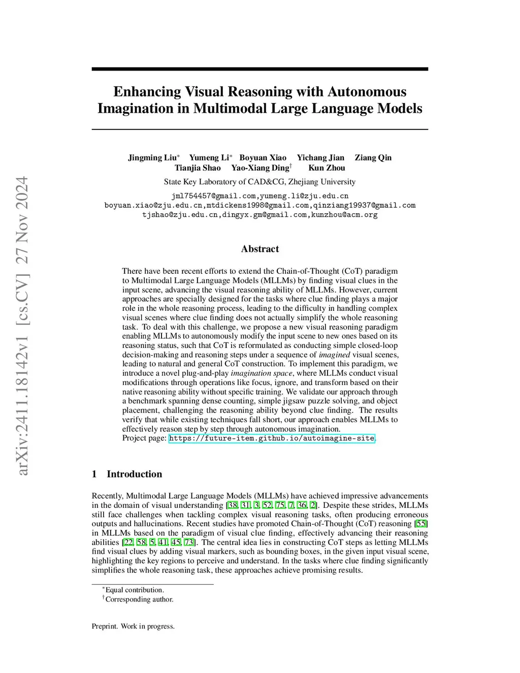 Under pure textual modality, Large Language Models (LLMs) have demonstrated remarkable success in complex reasoning tasks by decomposing them into simpler sub-problems. However, Multimodal Large Language Models (MLLMs) still struggle with some seemingly straightforward visual tasks, such as counting and solving jigsaw puzzles. We argue that these tasks challenge the ability of visual-to-textual conversion, where MLLMs convert visual information perceived from the input scene, to textual information for further reasoning and generating the answer. If the complexity of the visual input is beyond the perceptual capability of the MLLMs, without decomposing this conversion process, simply scaling inference-time reasoning cannot solve the task because it repeatedly encounters the same perceptual bottleneck. We propose an approach, autonomous imagination, to enable MLLMs to iteratively modify visual inputs (e.g. isolating objects, rearranging puzzle pieces) into intermediate visual states, decomposing visual-to-textual conversion into closed-loop visual modification steps. We show that, without any retraining, MLLMs can now solve tasks initially beyond their perceptual capability, highlighting that closed-loop visual modification can be an effective way of decomposing the visual reasoning task into solvable substeps. Our code and data are released atthis https URL.