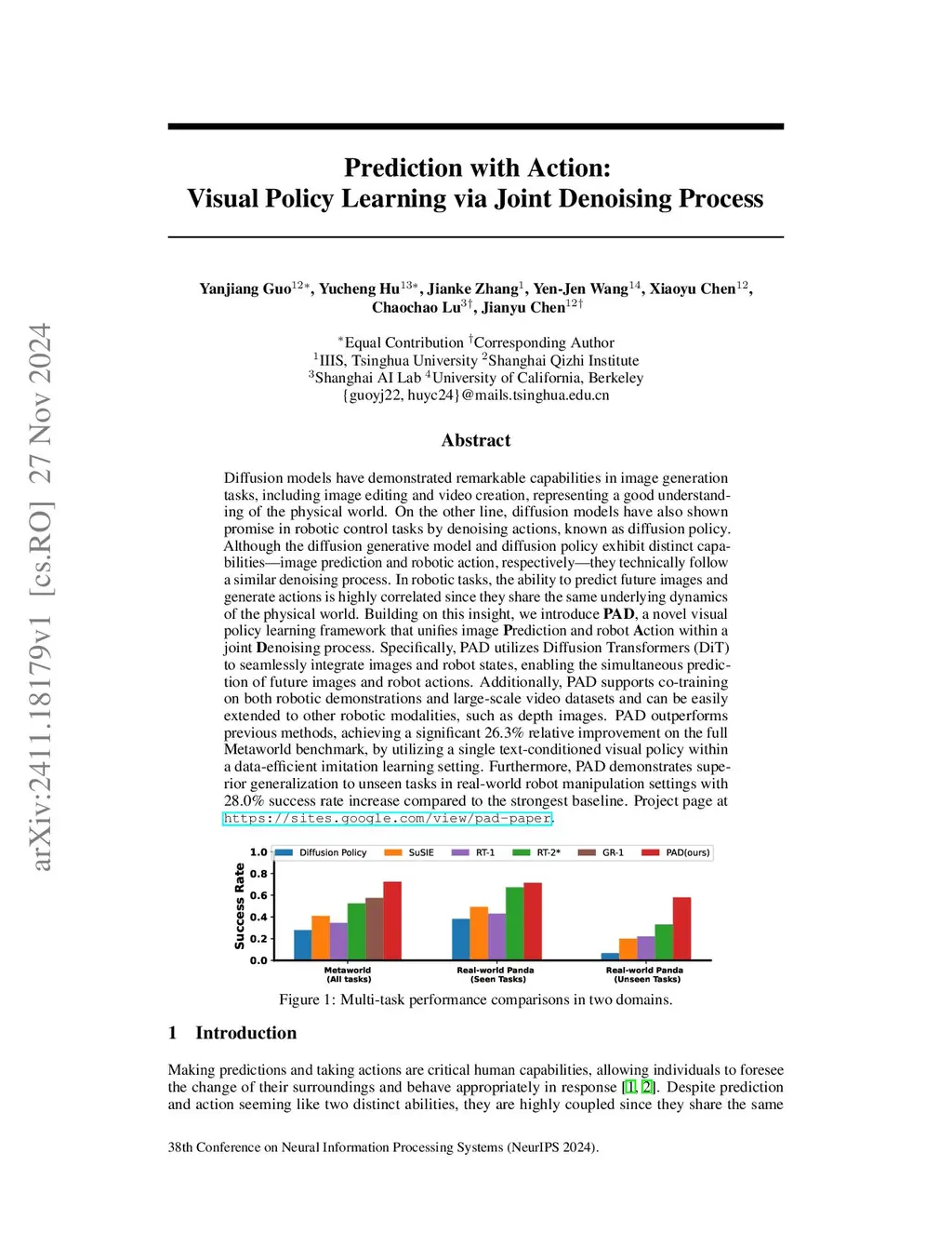 Diffusion models have demonstrated remarkable capabilities in image generation tasks, including image editing and video creation, representing a good understanding of the physical world. On the other line, diffusion models have also shown promise in robotic control tasks by denoising actions, known as diffusion policy. Although the diffusion generative model and diffusion policy exhibit distinct capabilities--image prediction and robotic action, respectively--they technically follow a similar denoising process. In robotic tasks, the ability to predict future images and generate actions is highly correlated since they share the same underlying dynamics of the physical world. Building on this insight, we introduce PAD, a novel visual policy learning framework that unifies image Prediction and robot Action within a joint Denoising process. Specifically, PAD utilizes Diffusion Transformers (DiT) to seamlessly integrate images and robot states, enabling the simultaneous prediction of future images and robot actions. Additionally, PAD supports co-training on both robotic demonstrations and large-scale video datasets and can be easily extended to other robotic modalities, such as depth images. PAD outperforms previous methods, achieving a significant 26.3% relative improvement on the full Metaworld benchmark, by utilizing a single text-conditioned visual policy within a data-efficient imitation learning setting. Furthermore, PAD demonstrates superior generalization to unseen tasks in real-world robot manipulation settings with 28.0% success rate increase compared to the strongest baseline. Project page at https://sites.google.com/view/pad-paper