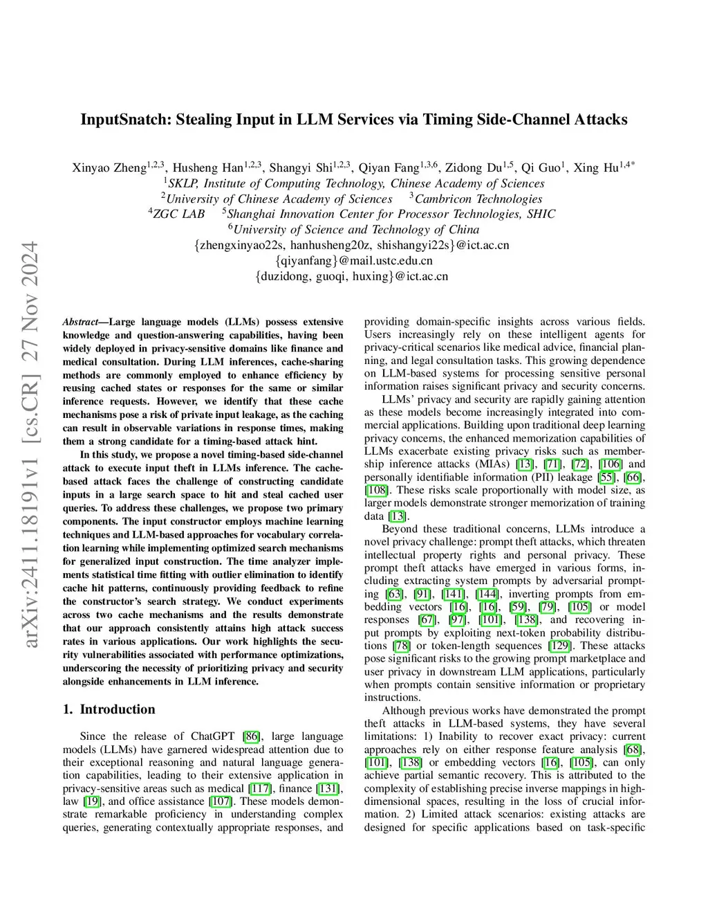 Large language models (LLMs) possess extensive knowledge and question-answering capabilities, having been widely deployed in privacy-sensitive domains like finance and medical consultation. During LLM inferences, cache-sharing methods are commonly employed to enhance efficiency by reusing cached states or responses for the same or similar inference requests. However, we identify that these cache mechanisms pose a risk of private input leakage, as the caching can result in observable variations in response times, making them a strong candidate for a timing-based attack hint. In this study, we propose a novel timing-based side-channel attack to execute input theft in LLMs inference. The cache-based attack faces the challenge of constructing candidate inputs in a large search space to hit and steal cached user queries. To address these challenges, we propose two primary components. The input constructor employs machine learning techniques and LLM-based approaches for vocabulary correlation learning while implementing optimized search mechanisms for generalized input construction. The time analyzer implements statistical time fitting with outlier elimination to identify cache hit patterns, continuously providing feedback to refine the constructor's search strategy. We conduct experiments across two cache mechanisms and the results demonstrate that our approach consistently attains high attack success rates in various applications. Our work highlights the security vulnerabilities associated with performance optimizations, underscoring the necessity of prioritizing privacy and security alongside enhancements in LLM inference.