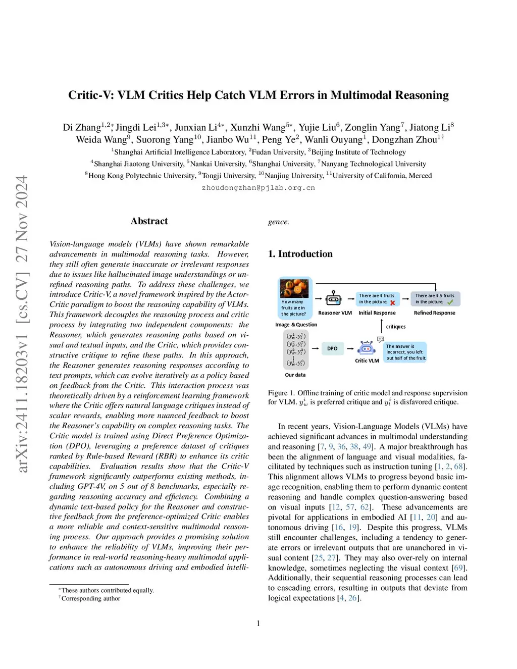 Vision-language models (VLMs) have shown remarkable advancements in multimodal reasoning tasks. However, they still often generate inaccurate or irrelevant responses due to issues like hallucinated image understandings or unrefined reasoning paths. To address these challenges, we introduce Critic-V, a novel framework inspired by the Actor-Critic paradigm to boost the reasoning capability of VLMs. This framework decouples the reasoning process and critic process by integrating two independent components: the Reasoner, which generates reasoning paths based on visual and textual inputs, and the Critic, which provides constructive critique to refine these paths. In this approach, the Reasoner generates reasoning responses according to text prompts, which can evolve iteratively as a policy based on feedback from the Critic. This interaction process was theoretically driven by a reinforcement learning framework where the Critic offers natural language critiques instead of scalar rewards, enabling more nuanced feedback to boost the Reasoner's capability on complex reasoning tasks. The Critic model is trained using Direct Preference Optimization (DPO), leveraging a preference dataset of critiques ranked by Rule-based Reward~(RBR) to enhance its critic capabilities. Evaluation results show that the Critic-V framework significantly outperforms existing methods, including GPT-4V, on 5 out of 8 benchmarks, especially regarding reasoning accuracy and efficiency. Combining a dynamic text-based policy for the Reasoner and constructive feedback from the preference-optimized Critic enables a more reliable and context-sensitive multimodal reasoning process. Our approach provides a promising solution to enhance the reliability of VLMs, improving their performance in real-world reasoning-heavy multimodal applications such as autonomous driving and embodied intelligence.