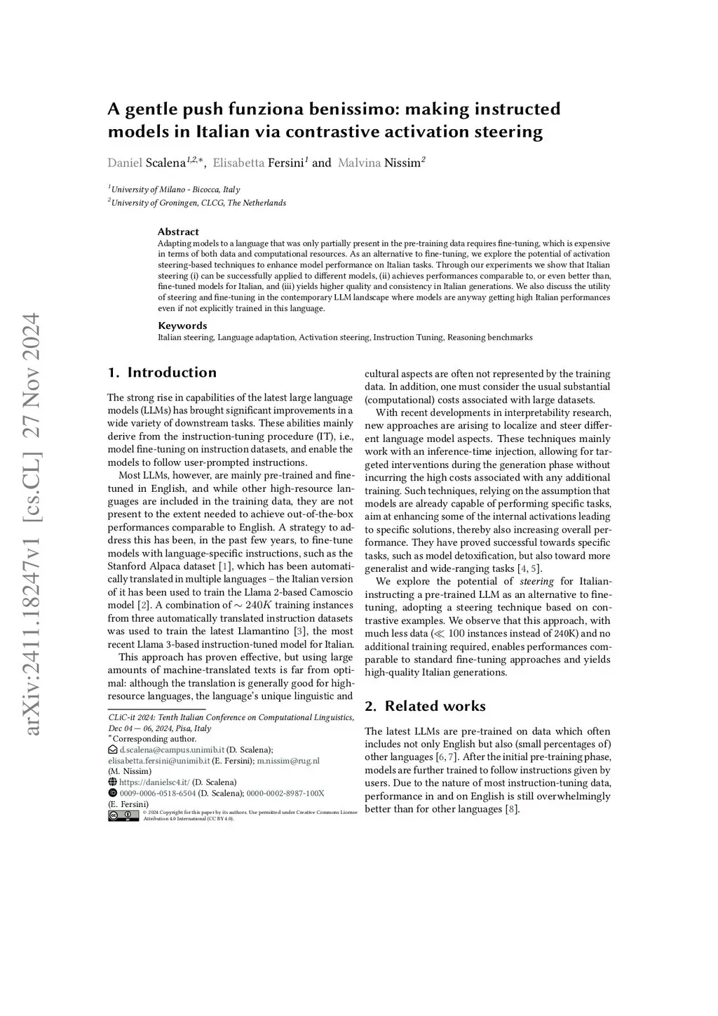 Adapting models to a language that was only partially present in the pre-training data requires fine-tuning, which is expensive in terms of both data and computational resources. As an alternative to fine-tuning, we explore the potential of activation steering-based techniques to enhance model performance on Italian tasks. Through our experiments we show that Italian steering (i) can be successfully applied to different models, (ii) achieves performances comparable to, or even better than, fine-tuned models for Italian, and (iii) yields higher quality and consistency in Italian generations. We also discuss the utility of steering and fine-tuning in the contemporary LLM landscape where models are anyway getting high Italian performances even if not explicitly trained in this language.