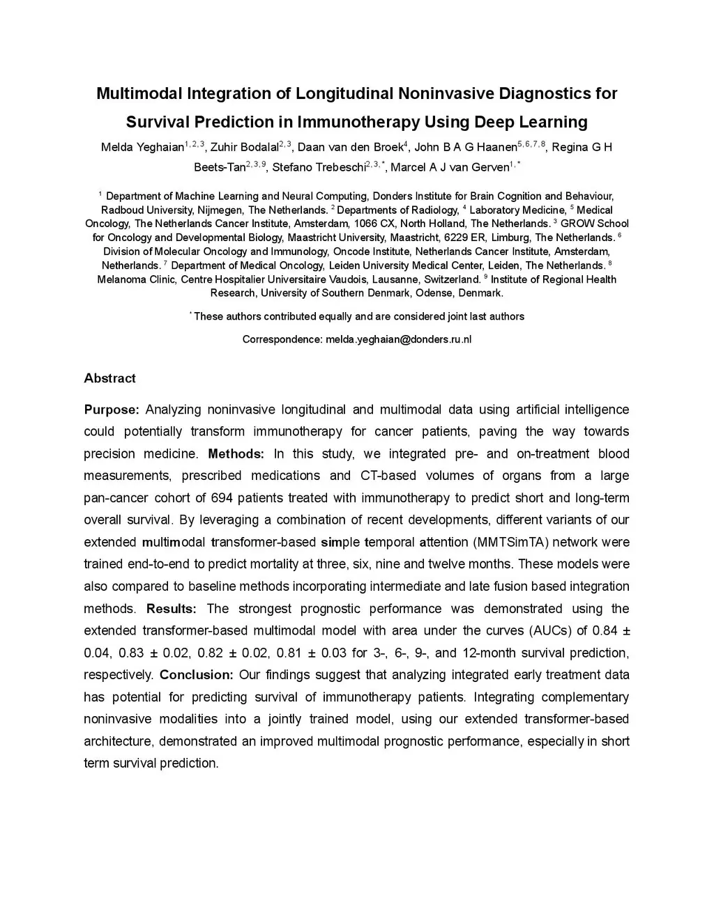 Multimodal Integration of Longitudinal Noninvasive Diagnostics for Survival Prediction in Immunotherapy Using Deep Learning
