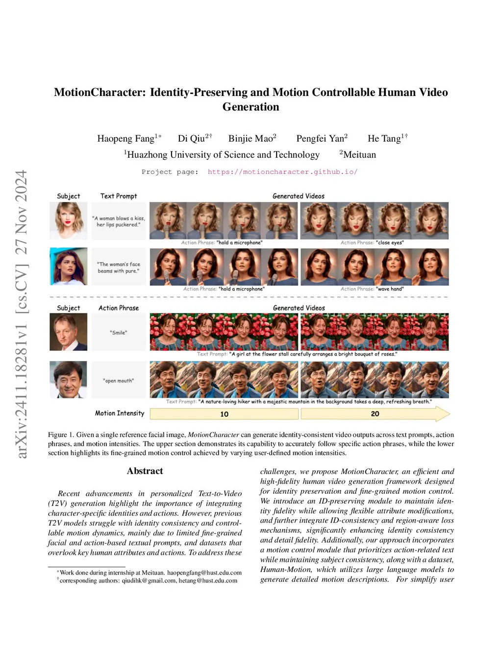 Recent advancements in personalized Text-to-Video (T2V) generation have made significant strides in synthesizing character-specific content. However, these methods face a critical limitation: the inability to perform fine-grained control over motion intensity. This limitation stems from an inherent entanglement of action semantics and their corresponding magnitudes within coarse textual descriptions, hindering the generation of nuanced human videos and limiting their applicability in scenarios demanding high precision, such as animating virtual avatars or synthesizing subtle micro-expressions. Furthermore, existing approaches often struggle to preserve high identity fidelity when other attributes are modified. To address these challenges, we introduce MotionCharacter, a framework for high-fidelity human video generation with precise motion control. At its core, MotionCharacter explicitly decouples motion into two independently controllable components: action type and motion intensity. This is achieved through two key technical contributions: (1) a Motion Control Module that leverages textual phrases to specify the action type and a quantifiable metric derived from optical flow to modulate its intensity, guided by a region-aware loss that localizes motion to relevant subject areas; and (2) an ID Content Insertion Module coupled with an ID-Consistency loss to ensure robust identity preservation during dynamic motions. To facilitate training for such fine-grained control, we also curate Human-Motion, a new large-scale dataset with detailed annotations for both motion and facial features. Extensive experiments demonstrate that MotionCharacter achieves substantial improvements over existing methods. Our framework excels in generating videos that are not only identity-consistent but also precisely adhere to specified motion types and intensities.