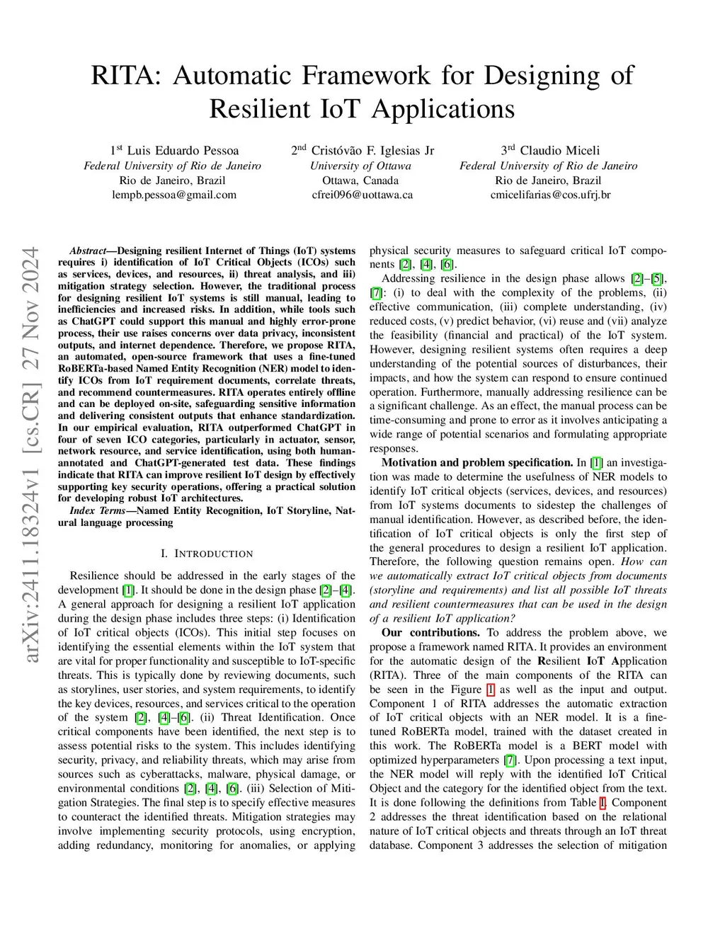 Designing resilient Internet of Things (IoT) systems requires i) identification of IoT Critical Objects (ICOs) such as services, devices, and resources, ii) threat analysis, and iii) mitigation strategy selection. However, the traditional process for designing resilient IoT systems is still manual, leading to inefficiencies and increased risks. In addition, while tools such as ChatGPT could support this manual and highly error-prone process, their use raises concerns over data privacy, inconsistent outputs, and internet dependence. Therefore, we propose RITA, an automated, open-source framework that uses a fine-tuned RoBERTa-based Named Entity Recognition (NER) model to identify ICOs from IoT requirement documents, correlate threats, and recommend countermeasures. RITA operates entirely offline and can be deployed on-site, safeguarding sensitive information and delivering consistent outputs that enhance standardization. In our empirical evaluation, RITA outperformed ChatGPT in four of seven ICO categories, particularly in actuator, sensor, network resource, and service identification, using both human-annotated and ChatGPT-generated test data. These findings indicate that RITA can improve resilient IoT design by effectively supporting key security operations, offering a practical solution for developing robust IoT architectures.