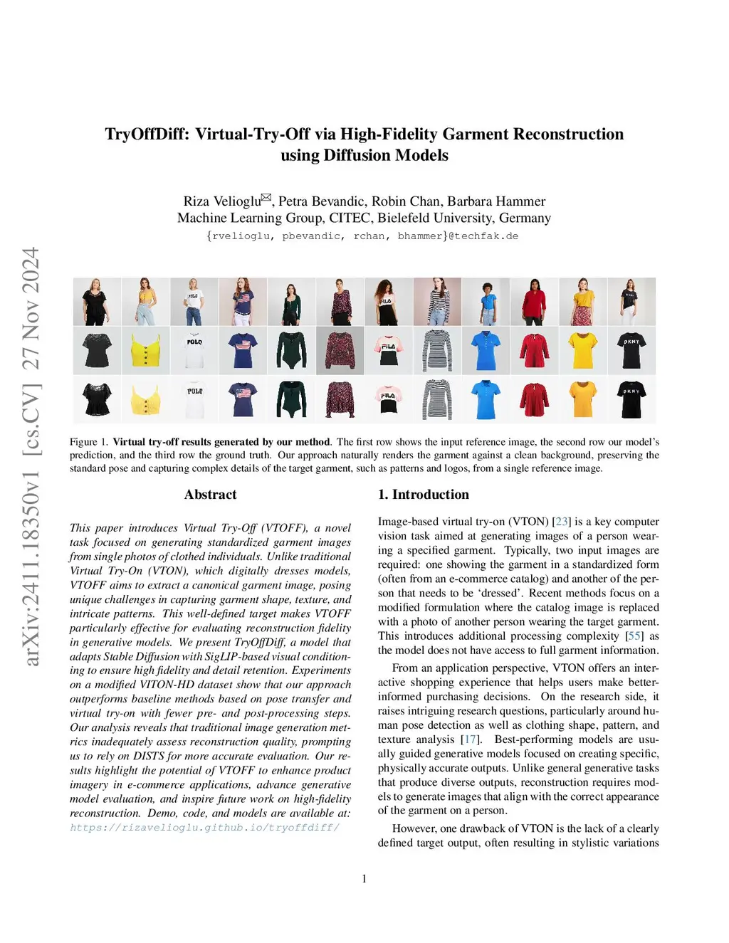 This paper introduces Virtual Try-Off (VTOFF), a novel task focused on generating standardized garment images from single photos of clothed individuals. Unlike traditional Virtual Try-On (VTON), which digitally dresses models, VTOFF aims to extract a canonical garment image, posing unique challenges in capturing garment shape, texture, and intricate patterns. This well-defined target makes VTOFF particularly effective for evaluating reconstruction fidelity in generative models. We present TryOffDiff, a model that adapts Stable Diffusion with SigLIP-based visual conditioning to ensure high fidelity and detail retention. Experiments on a modified VITON-HD dataset show that our approach outperforms baseline methods based on pose transfer and virtual try-on with fewer pre- and post-processing steps. Our analysis reveals that traditional image generation metrics inadequately assess reconstruction quality, prompting us to rely on DISTS for more accurate evaluation. Our results highlight the potential of VTOFF to enhance product imagery in e-commerce applications, advance generative model evaluation, and inspire future work on high-fidelity reconstruction. Demo, code, and models are available at: https://rizavelioglu.github.io/tryoffdiff/