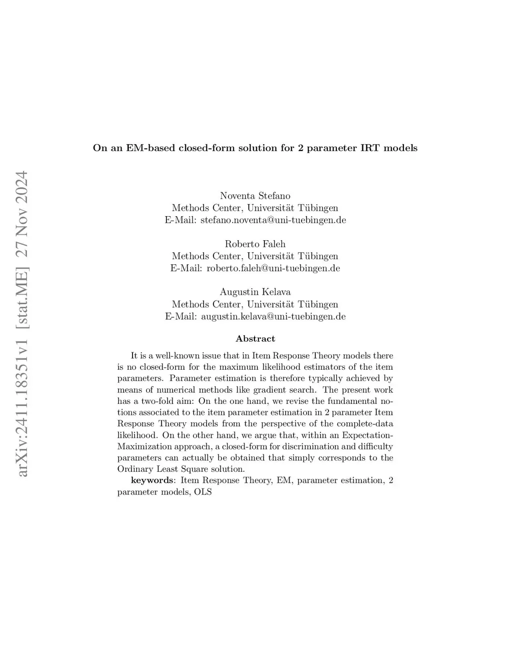 It is a well-known issue that in Item Response Theory models there is no closed-form for the maximum likelihood estimators of the item parameters. Parameter estimation is therefore typically achieved by means of numerical methods like gradient search. The present work has a two-fold aim: On the one hand, we revise the fundamental notions associated to the item parameter estimation in 2 parameter Item Response Theory models from the perspective of the complete-data likelihood. On the other hand, we argue that, within an Expectation-Maximization approach, a closed-form for discrimination and difficulty parameters can actually be obtained that simply corresponds to the Ordinary Least Square solution.
