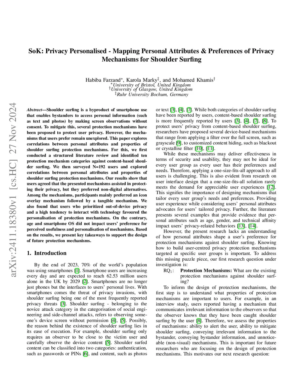Shoulder surfing is a byproduct of smartphone use that enables bystanders to access personal information (such as text and photos) by making screen observations without consent. To mitigate this, several protection mechanisms have been proposed to protect user privacy. However, the mechanisms that users prefer remain unexplored. This paper explores correlations between personal attributes and properties of shoulder surfing protection mechanisms. For this, we first conducted a structured literature review and identified ten protection mechanism categories against content-based shoulder surfing. We then surveyed N=192 users and explored correlations between personal attributes and properties of shoulder surfing protection mechanisms. Our results show that users agreed that the presented mechanisms assisted in protecting their privacy, but they preferred non-digital alternatives. Among the mechanisms, participants mainly preferred an icon overlay mechanism followed by a tangible mechanism. We also found that users who prioritized out-of-device privacy and a high tendency to interact with technology favoured the personalisation of protection mechanisms. On the contrary, age and smartphone OS did not impact users' preference for perceived usefulness and personalisation of mechanisms. Based on the results, we present key takeaways to support the design of future protection mechanisms.