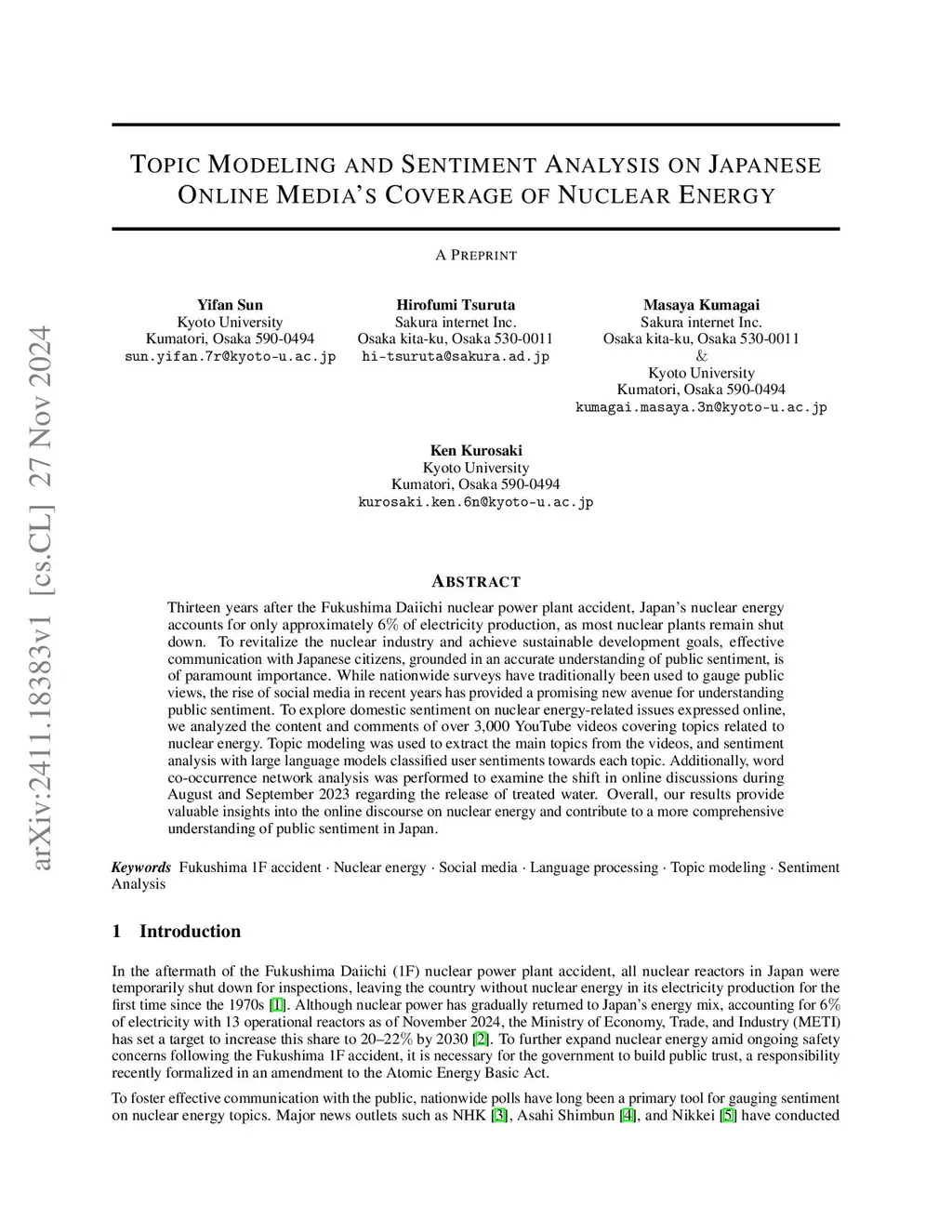 Thirteen years after the Fukushima Daiichi nuclear power plant accident, Japan's nuclear energy accounts for only approximately 6% of electricity production, as most nuclear plants remain shut down. To revitalize the nuclear industry and achieve sustainable development goals, effective communication with Japanese citizens, grounded in an accurate understanding of public sentiment, is of paramount importance. While nationwide surveys have traditionally been used to gauge public views, the rise of social media in recent years has provided a promising new avenue for understanding public sentiment. To explore domestic sentiment on nuclear energy-related issues expressed online, we analyzed the content and comments of over 3,000 YouTube videos covering topics related to nuclear energy. Topic modeling was used to extract the main topics from the videos, and sentiment analysis with large language models classified user sentiments towards each topic. Additionally, word co-occurrence network analysis was performed to examine the shift in online discussions during August and September 2023 regarding the release of treated water. Overall, our results provide valuable insights into the online discourse on nuclear energy and contribute to a more comprehensive understanding of public sentiment in Japan.