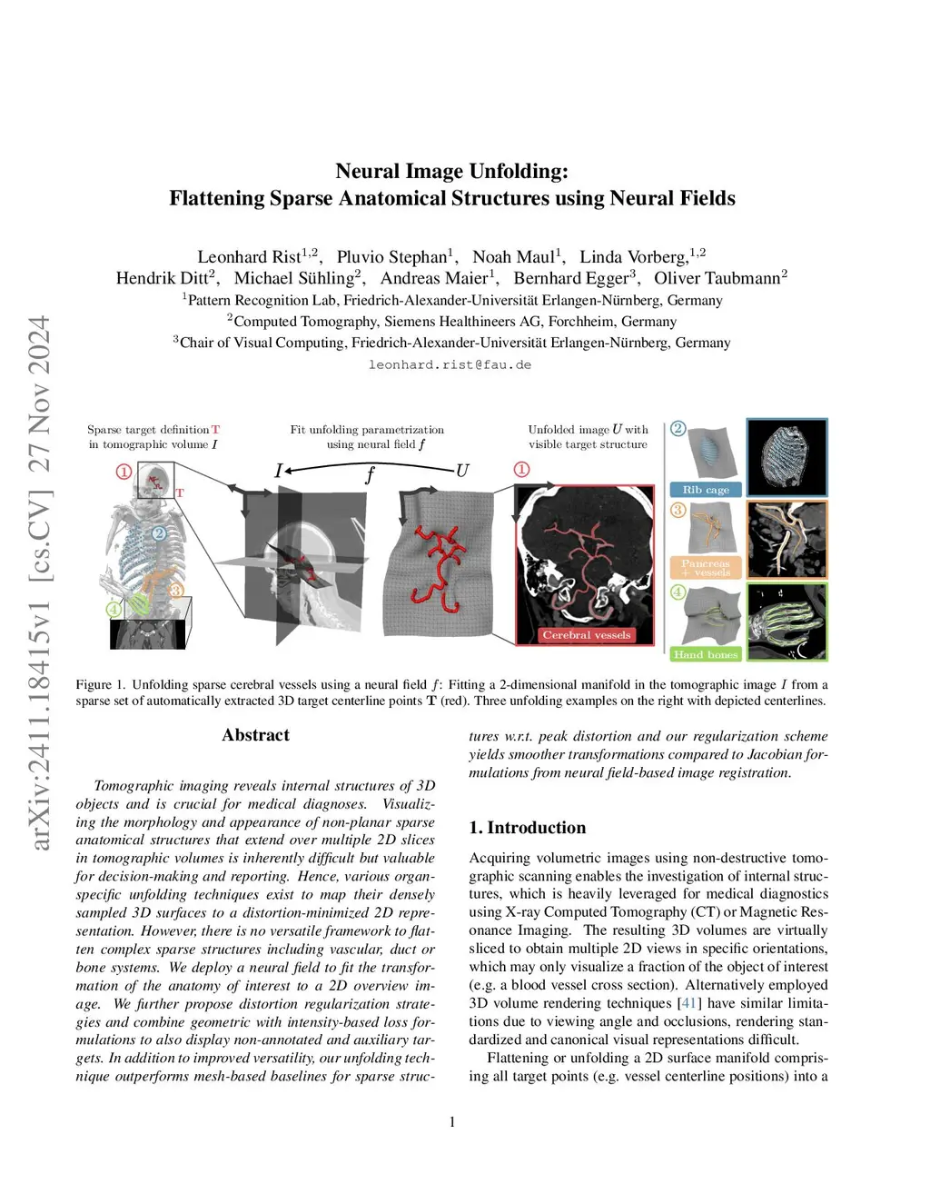 Tomographic imaging reveals internal structures of 3D objects and is crucial for medical diagnoses. Visualizing the morphology and appearance of non-planar sparse anatomical structures that extend over multiple 2D slices in tomographic volumes is inherently difficult but valuable for decision-making and reporting. Hence, various organ-specific unfolding techniques exist to map their densely sampled 3D surfaces to a distortion-minimized 2D representation. However, there is no versatile framework to flatten complex sparse structures including vascular, duct or bone systems. We deploy a neural field to fit the transformation of the anatomy of interest to a 2D overview image. We further propose distortion regularization strategies and combine geometric with intensity-based loss formulations to also display non-annotated and auxiliary targets. In addition to improved versatility, our unfolding technique outperforms mesh-based baselines for sparse structures w.r.t. peak distortion and our regularization scheme yields smoother transformations compared to Jacobian formulations from neural field-based image registration.