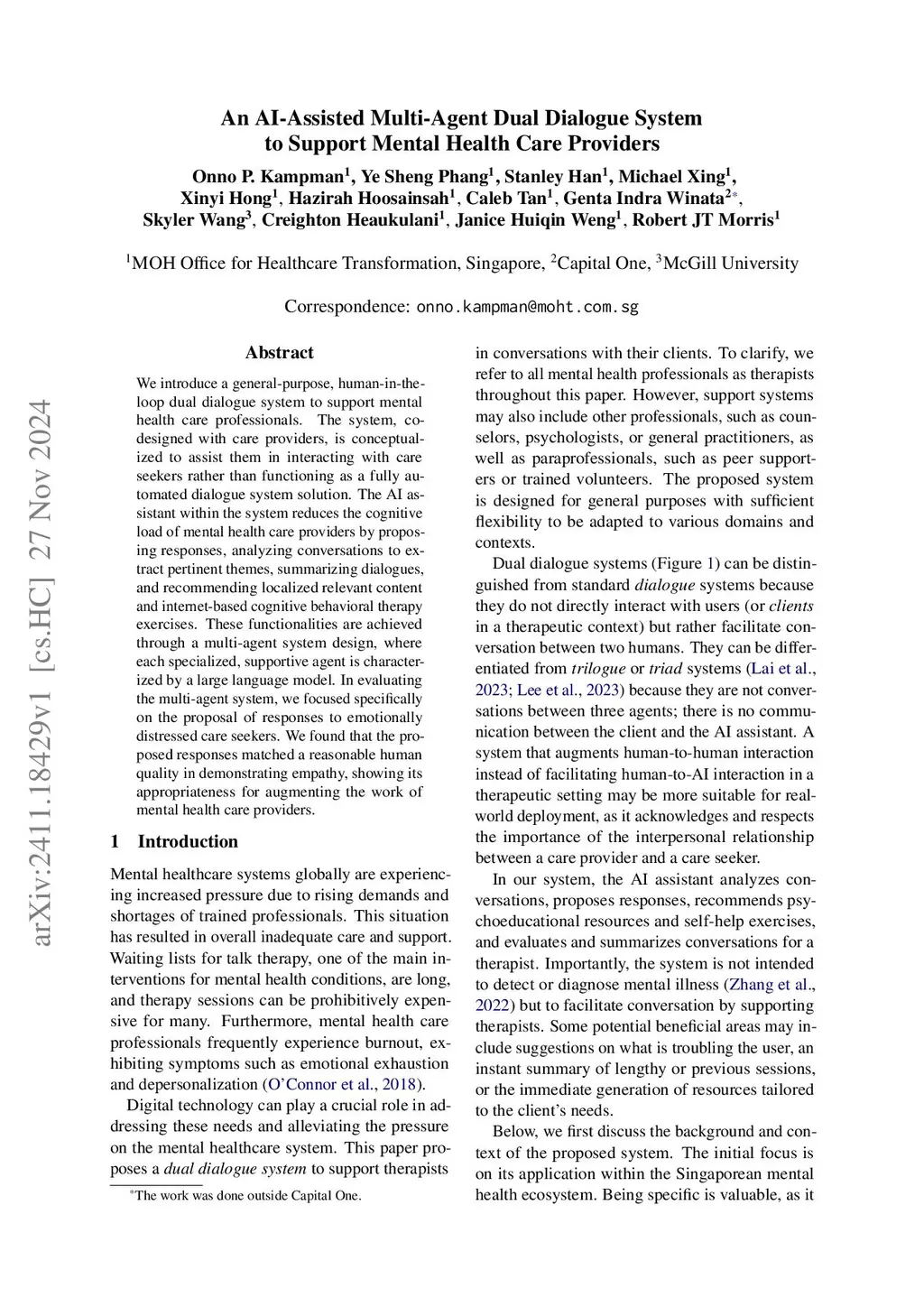 We introduce a general-purpose, human-in-the-loop dual dialogue system to support mental health care professionals. The system, co-designed with care providers, is conceptualized to assist them in interacting with care seekers rather than functioning as a fully automated dialogue system solution. The AI assistant within the system reduces the cognitive load of mental health care providers by proposing responses, analyzing conversations to extract pertinent themes, summarizing dialogues, and recommending localized relevant content and internet-based cognitive behavioral therapy exercises. These functionalities are achieved through a multi-agent system design, where each specialized, supportive agent is characterized by a large language model. In evaluating the multi-agent system, we focused specifically on the proposal of responses to emotionally distressed care seekers. We found that the proposed responses matched a reasonable human quality in demonstrating empathy, showing its appropriateness for augmenting the work of mental health care providers.
