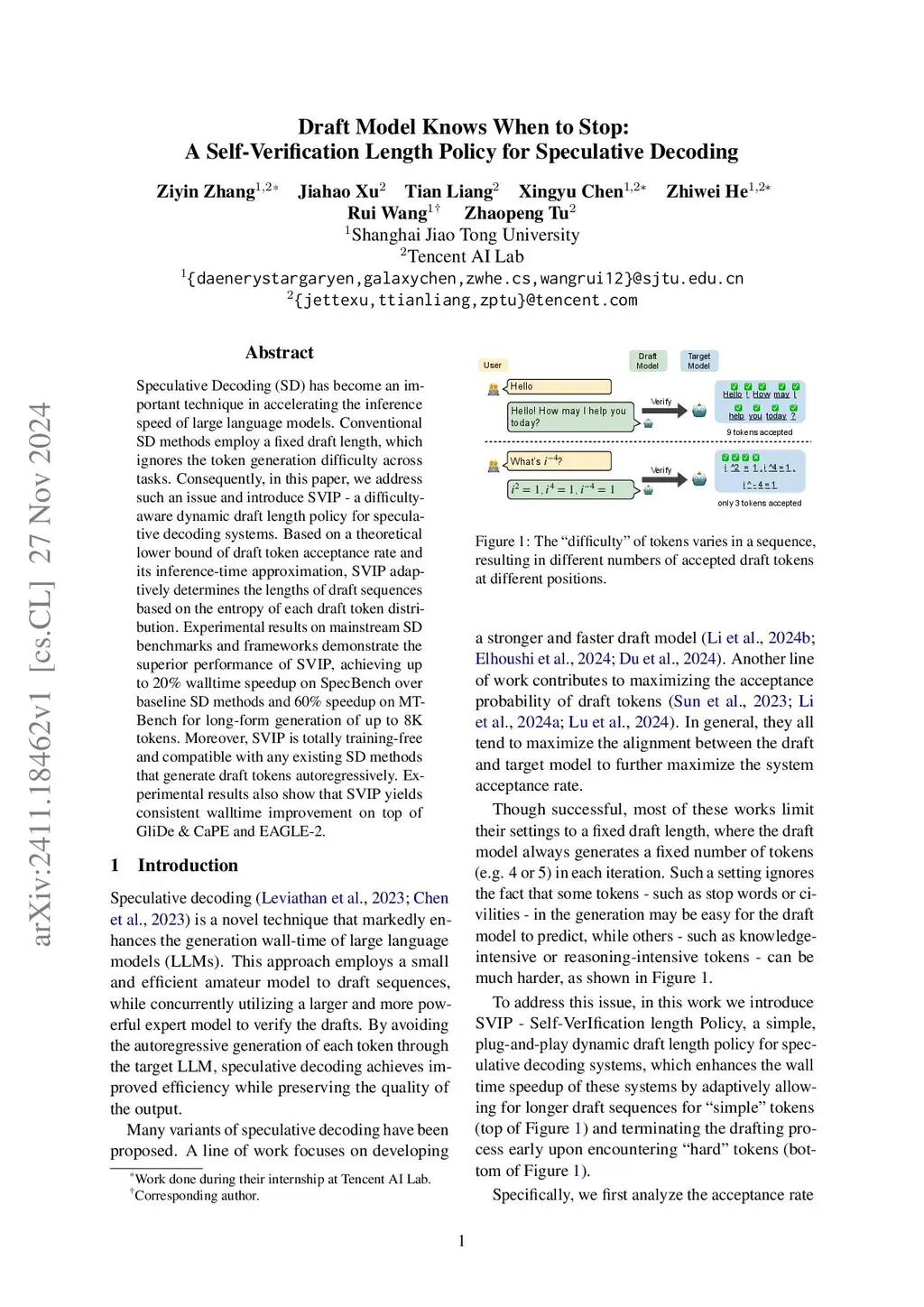 Conventional speculative decoding (SD) methods utilize a predefined length policy for proposing drafts, which implies the premise that the target model smoothly accepts the proposed draft tokens. However, reality deviates from this assumption: the oracle draft length varies significantly, and the fixed-length policy hardly satisfies such a requirement. Moreover, such discrepancy is further exacerbated in scenarios involving complex reasoning and long-form generation, particularly under test-time scaling for reasoning-specialized models. Through both theoretical and empirical estimation, we establish that the discrepancy between the draft and target models can be approximated by the draft model's prediction entropy: a high entropy indicates a low acceptance rate of draft tokens, and vice versa. Based on this insight, we propose SVIP: Self-Verification Length Policy for Long-Context Speculative Decoding, which is a training-free dynamic length policy for speculative decoding systems that adaptively determines the lengths of draft sequences by referring to the draft entropy. Experimental results on mainstream SD benchmarks as well as reasoning-heavy benchmarks demonstrate the superior performance of SVIP, achieving up to 17% speedup on MT-Bench at 8K context compared with fixed draft lengths, and 22% speedup for QwQ in long-form reasoning.