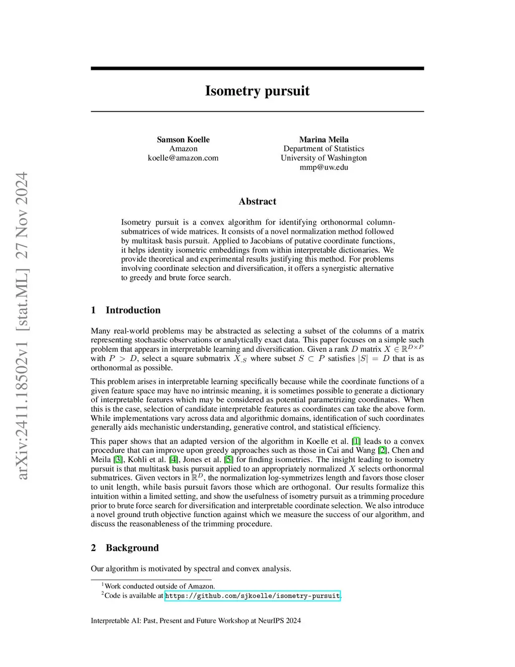 Isometry pursuit is a convex algorithm for identifying orthonormal column-submatrices of wide matrices. It consists of a novel normalization method followed by multitask basis pursuit. Applied to Jacobians of putative coordinate functions, it helps identity isometric embeddings from within interpretable dictionaries. We provide theoretical and experimental results justifying this method. For problems involving coordinate selection and diversification, it offers a synergistic alternative to greedy and brute force search.