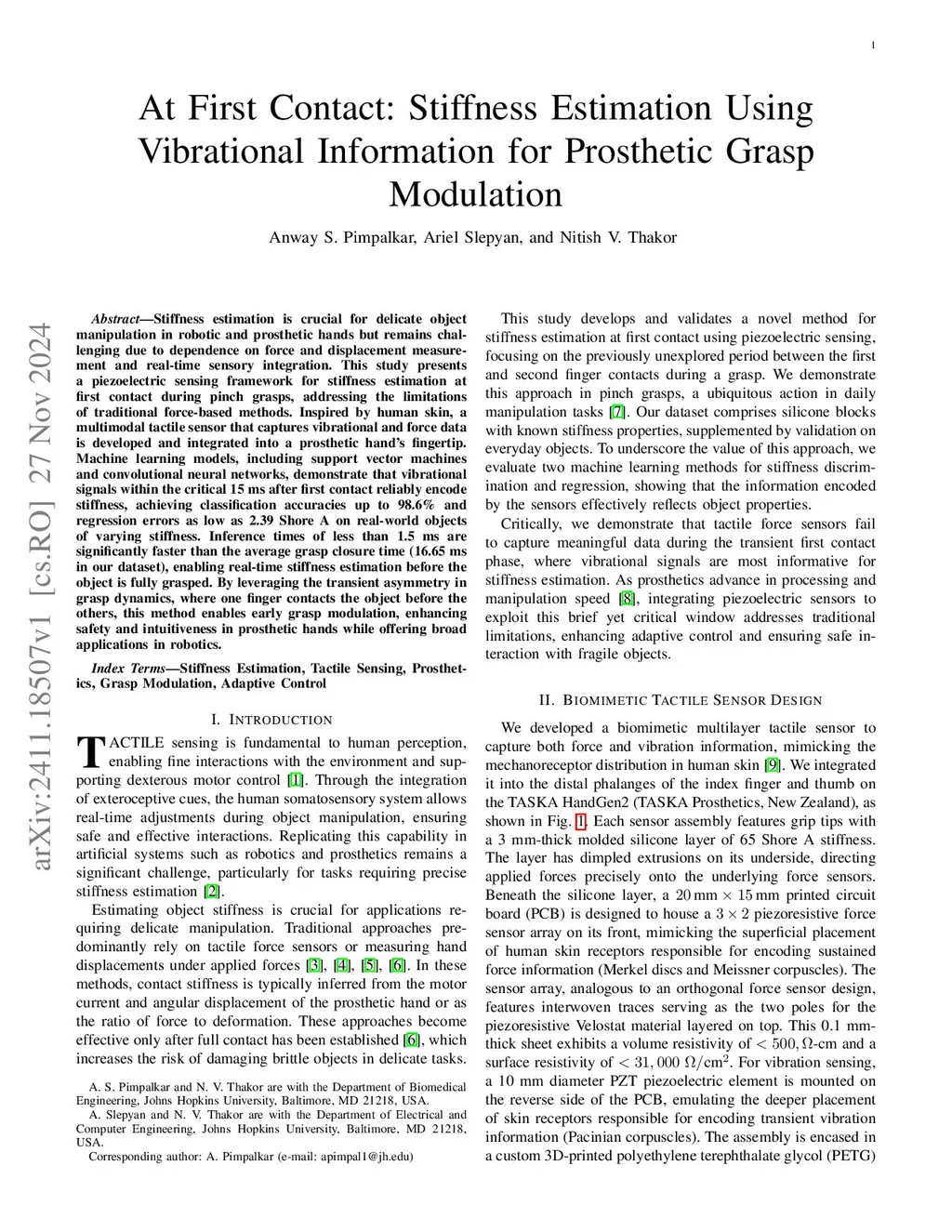 Stiffness estimation is crucial for delicate object manipulation in robotic and prosthetic hands but remains challenging due to dependence on force and displacement measurement and real-time sensory integration. This study presents a piezoelectric sensing framework for stiffness estimation at first contact during pinch grasps, addressing the limitations of traditional force-based methods. Inspired by human skin, a multimodal tactile sensor that captures vibrational and force data is developed and integrated into a prosthetic hand's fingertip. Machine learning models, including support vector machines and convolutional neural networks, demonstrate that vibrational signals within the critical 15 ms after first contact reliably encode stiffness, achieving classification accuracies up to 98.6% and regression errors as low as 2.39 Shore A on real-world objects of varying stiffness. Inference times of less than 1.5 ms are significantly faster than the average grasp closure time (16.65 ms in our dataset), enabling real-time stiffness estimation before the object is fully grasped. By leveraging the transient asymmetry in grasp dynamics, where one finger contacts the object before the others, this method enables early grasp modulation, enhancing safety and intuitiveness in prosthetic hands while offering broad applications in robotics.