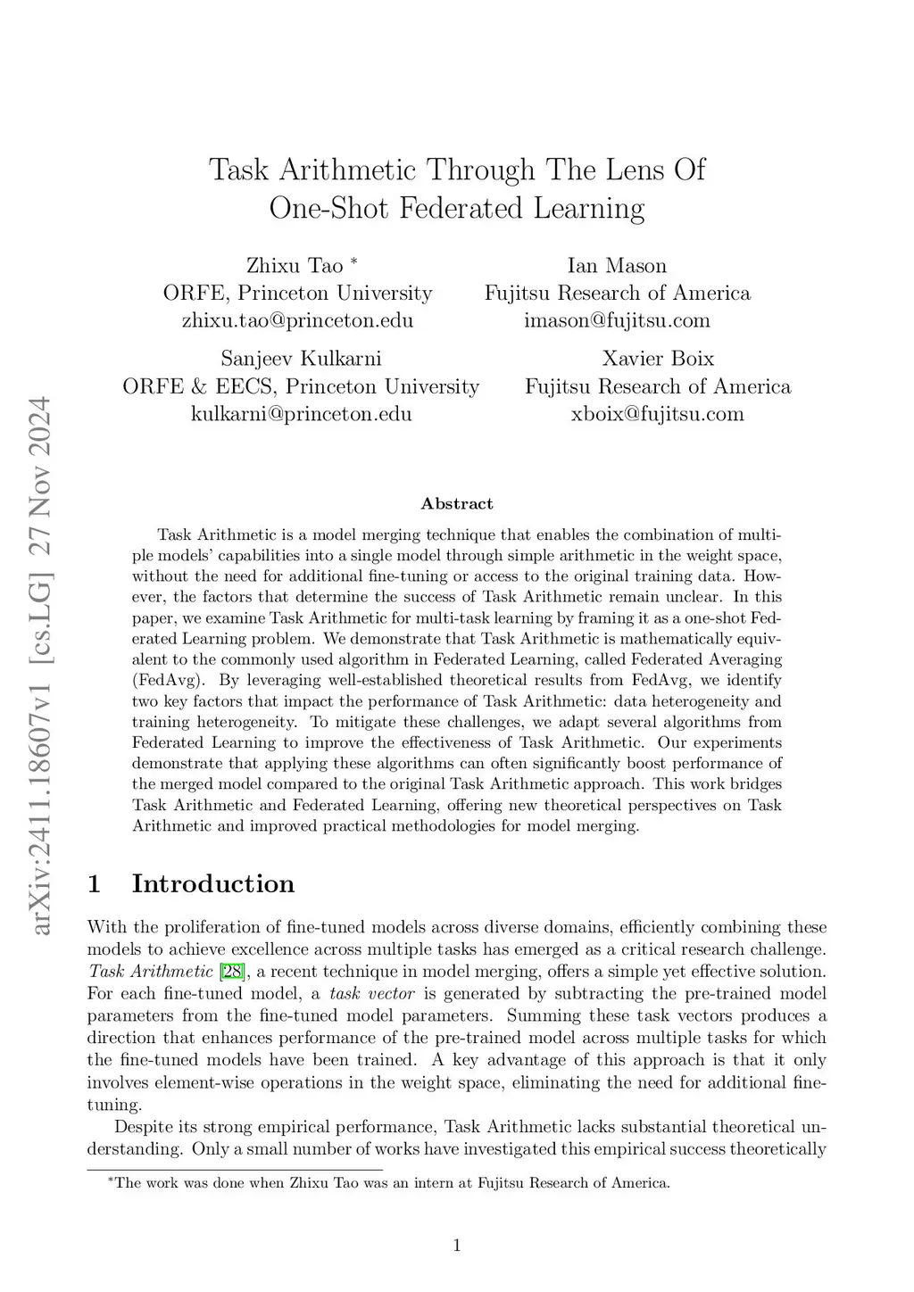 Task Arithmetic is a model merging technique that enables the combination of multiple models' capabilities into a single model through simple arithmetic in the weight space, without the need for additional fine-tuning or access to the original training data. However, the factors that determine the success of Task Arithmetic remain unclear. In this paper, we examine Task Arithmetic for multi-task learning by framing it as a one-shot Federated Learning problem. We demonstrate that Task Arithmetic is mathematically equivalent to the commonly used algorithm in Federated Learning, called Federated Averaging (FedAvg). By leveraging well-established theoretical results from FedAvg, we identify two key factors that impact the performance of Task Arithmetic: data heterogeneity and training heterogeneity. To mitigate these challenges, we adapt several algorithms from Federated Learning to improve the effectiveness of Task Arithmetic. Our experiments demonstrate that applying these algorithms can often significantly boost performance of the merged model compared to the original Task Arithmetic approach. This work bridges Task Arithmetic and Federated Learning, offering new theoretical perspectives on Task Arithmetic and improved practical methodologies for model merging.