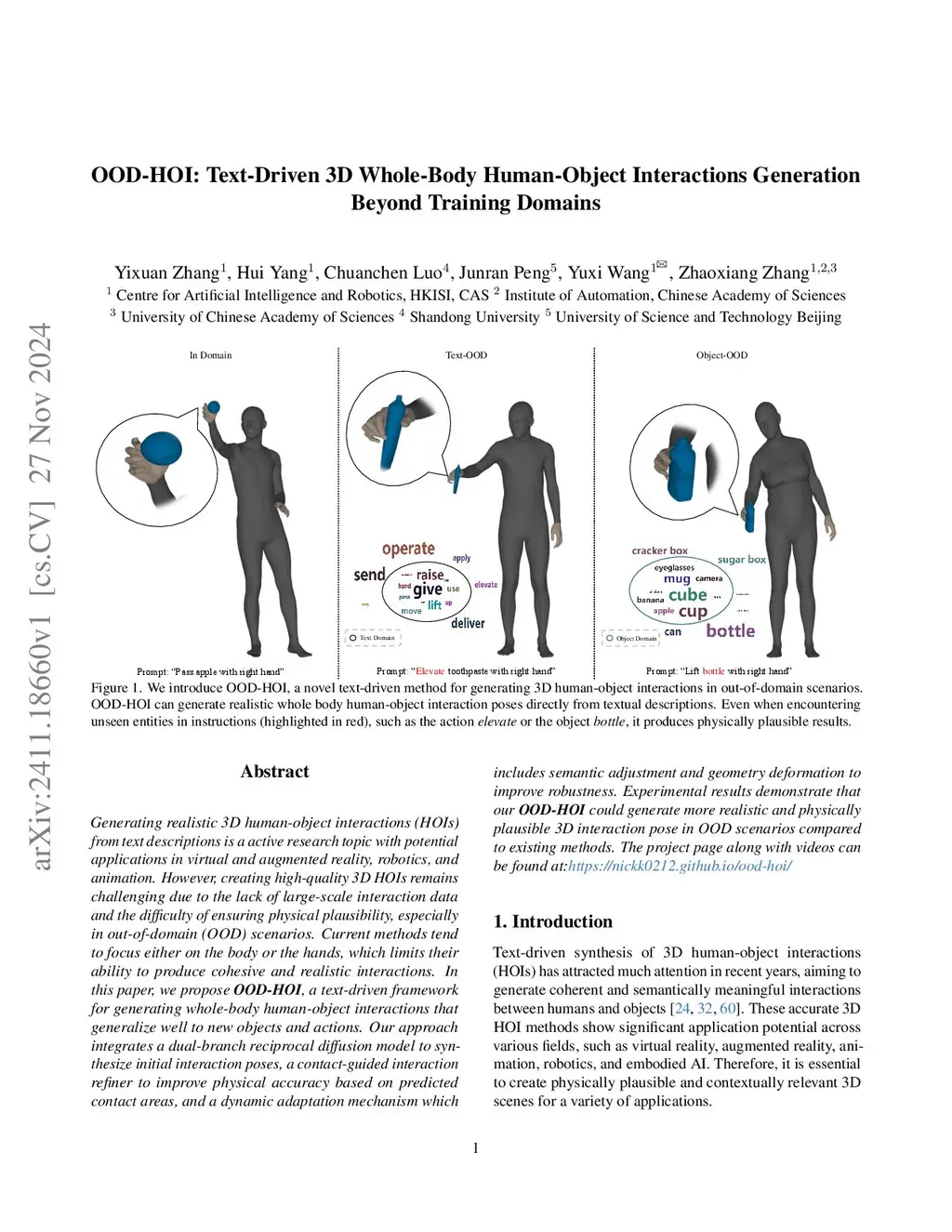 Generating realistic 3D human-object interactions (HOIs) from text descriptions is a active research topic with potential applications in virtual and augmented reality, robotics, and animation. However, creating high-quality 3D HOIs remains challenging due to the lack of large-scale interaction data and the difficulty of ensuring physical plausibility, especially in out-of-domain (OOD) scenarios. Current methods tend to focus either on the body or the hands, which limits their ability to produce cohesive and realistic interactions. In this paper, we propose OOD-HOI, a text-driven framework for generating whole-body human-object interactions that generalize well to new objects and actions. Our approach integrates a dual-branch reciprocal diffusion model to synthesize initial interaction poses, a contact-guided interaction refiner to improve physical accuracy based on predicted contact areas, and a dynamic adaptation mechanism which includes semantic adjustment and geometry deformation to improve robustness. Experimental results demonstrate that our OOD-HOI could generate more realistic and physically plausible 3D interaction pose in OOD scenarios compared to existing methods.