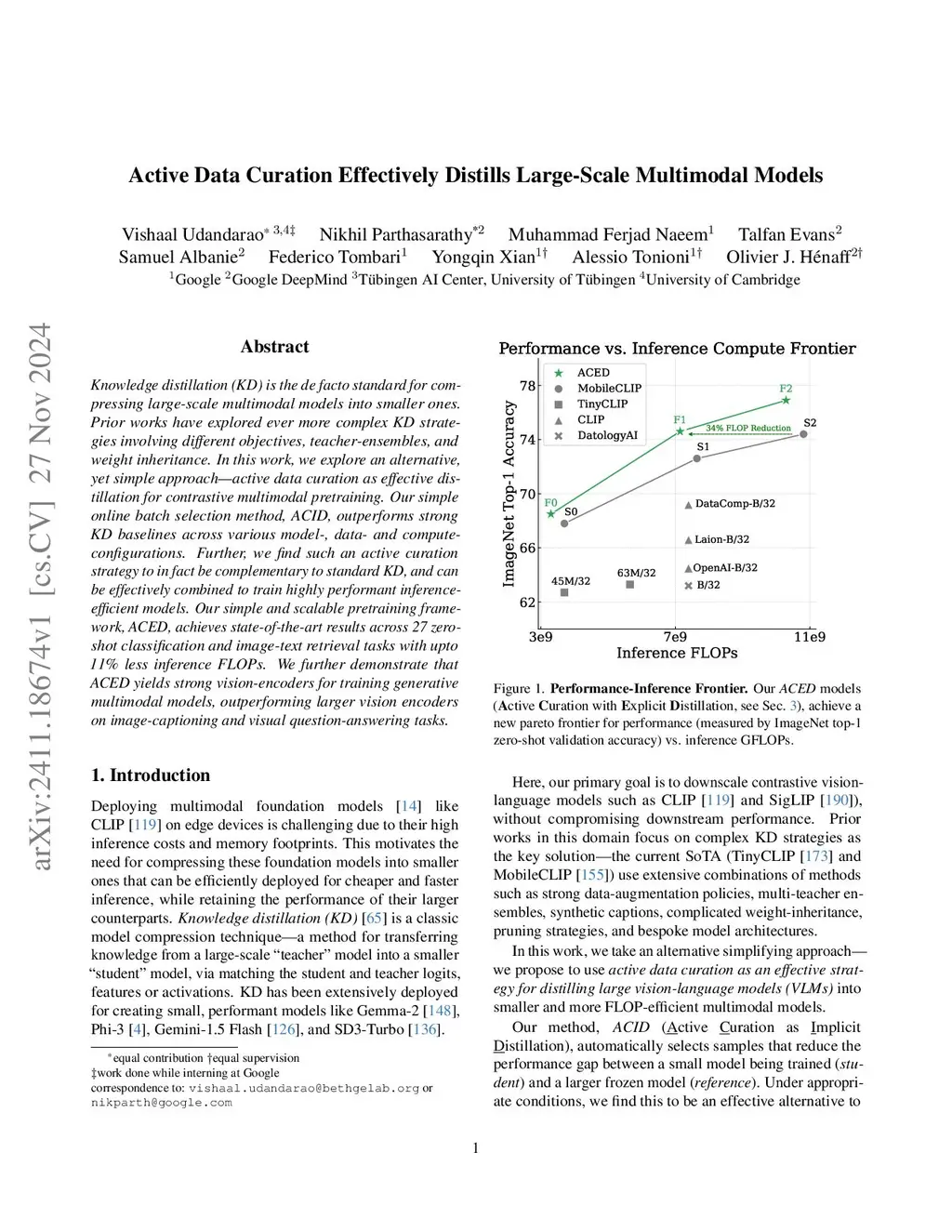 Knowledge distillation (KD) is the de facto standard for compressing large-scale models into smaller ones. Prior works have explored ever more complex KD strategies involving different objective functions, teacher-ensembles, and weight inheritance. In this work we explore an alternative, yet simple approach -- active data curation as effective distillation for contrastive multimodal pretraining. Our simple online batch selection method, ACID, outperforms strong KD baselines across various model-, data- and compute-configurations. Further, we find such an active data curation strategy to in fact be complementary to standard KD, and can be effectively combined to train highly performant inference-efficient models. Our simple and scalable pretraining framework, ACED, achieves state-of-the-art results across 27 zero-shot classification and retrieval tasks with upto 11% less inference FLOPs. We further demonstrate that our ACED models yield strong vision-encoders for training generative multimodal models in the LiT-Decoder setting, outperforming larger vision encoders for image-captioning and visual question-answering tasks.