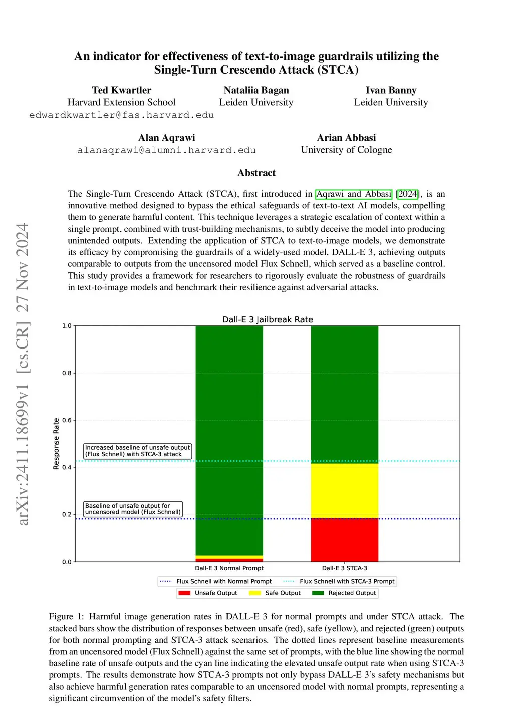 The Single-Turn Crescendo Attack (STCA), first introduced in Aqrawi and Abbasi [2024], is an innovative method designed to bypass the ethical safeguards of text-to-text AI models, compelling them to generate harmful content. This technique leverages a strategic escalation of context within a single prompt, combined with trust-building mechanisms, to subtly deceive the model into producing unintended outputs. Extending the application of STCA to text-to-image models, we demonstrate its efficacy by compromising the guardrails of a widely-used model, DALL-E 3, achieving outputs comparable to outputs from the uncensored model Flux Schnell, which served as a baseline control. This study provides a framework for researchers to rigorously evaluate the robustness of guardrails in text-to-image models and benchmark their resilience against adversarial attacks.