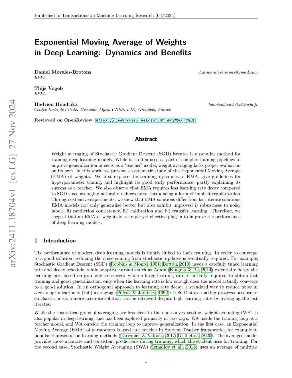 Weight averaging of Stochastic Gradient Descent (SGD) iterates is a popular method for training deep learning models. While it is often used as part of complex training pipelines to improve generalization or serve as a `teacher' model, weight averaging lacks proper evaluation on its own. In this work, we present a systematic study of the Exponential Moving Average (EMA) of weights. We first explore the training dynamics of EMA, give guidelines for hyperparameter tuning, and highlight its good early performance, partly explaining its success as a teacher. We also observe that EMA requires less learning rate decay compared to SGD since averaging naturally reduces noise, introducing a form of implicit regularization. Through extensive experiments, we show that EMA solutions differ from last-iterate solutions. EMA models not only generalize better but also exhibit improved i) robustness to noisy labels, ii) prediction consistency, iii) calibration and iv) transfer learning. Therefore, we suggest that an EMA of weights is a simple yet effective plug-in to improve the performance of deep learning models.