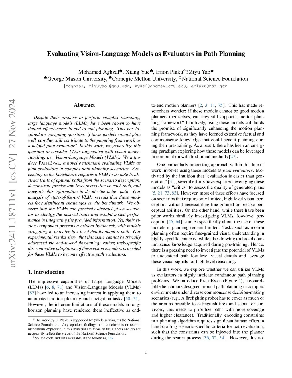 Despite their promise to perform complex reasoning, large language models (LLMs) have been shown to have limited effectiveness in end-to-end planning. This has inspired an intriguing question: if these models cannot plan well, can they still contribute to the planning framework as a helpful plan evaluator? In this work, we generalize this question to consider LLMs augmented with visual understanding, i.e., Vision-Language Models (VLMs). We introduce PathEval, a novel benchmark evaluating VLMs as plan evaluators in complex path-planning scenarios. Succeeding in the benchmark requires a VLM to be able to abstract traits of optimal paths from the scenario description, demonstrate precise low-level perception on each path, and integrate this information to decide the better path. Our analysis of state-of-the-art VLMs reveals that these models face significant challenges on the benchmark. We observe that the VLMs can precisely abstract given scenarios to identify the desired traits and exhibit mixed performance in integrating the provided information. Yet, their vision component presents a critical bottleneck, with models struggling to perceive low-level details about a path. Our experimental results show that this issue cannot be trivially addressed via end-to-end fine-tuning; rather, task-specific discriminative adaptation of these vision encoders is needed for these VLMs to become effective path evaluators.