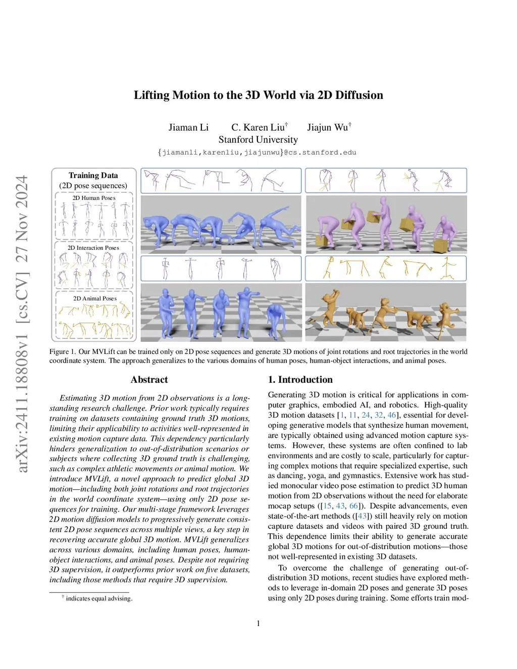 Estimating 3D motion from 2D observations is a long-standing research challenge. Prior work typically requires training on datasets containing ground truth 3D motions, limiting their applicability to activities well-represented in existing motion capture data. This dependency particularly hinders generalization to out-of-distribution scenarios or subjects where collecting 3D ground truth is challenging, such as complex athletic movements or animal motion. We introduce MVLift, a novel approach to predict global 3D motion -- including both joint rotations and root trajectories in the world coordinate system -- using only 2D pose sequences for training. Our multi-stage framework leverages 2D motion diffusion models to progressively generate consistent 2D pose sequences across multiple views, a key step in recovering accurate global 3D motion. MVLift generalizes across various domains, including human poses, human-object interactions, and animal poses. Despite not requiring 3D supervision, it outperforms prior work on five datasets, including those methods that require 3D supervision.