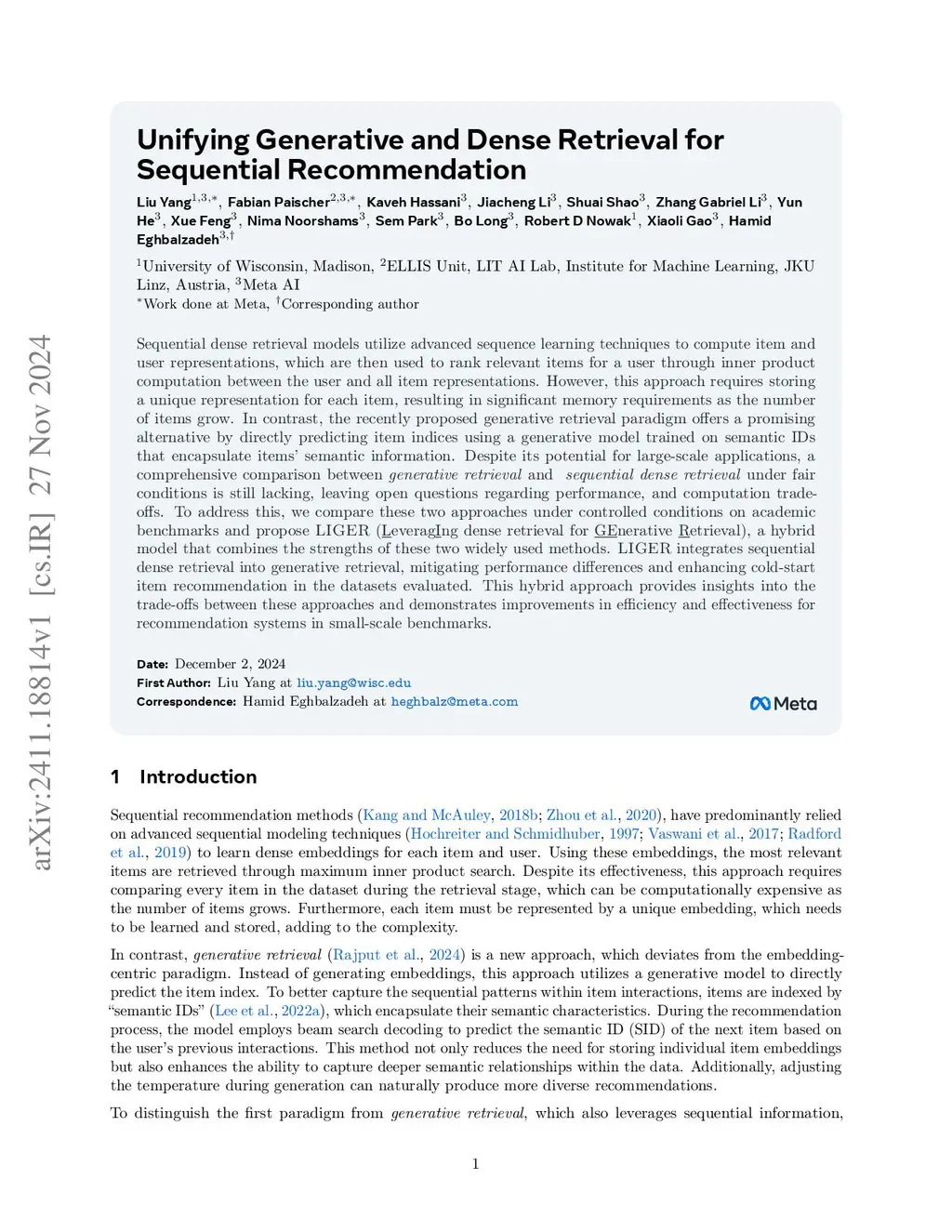 Sequential dense retrieval models utilize advanced sequence learning techniques to compute item and user representations, which are then used to rank relevant items for a user through inner product computation between the user and all item representations. However, this approach requires storing a unique representation for each item, resulting in significant memory requirements as the number of items grow. In contrast, the recently proposed generative retrieval paradigm offers a promising alternative by directly predicting item indices using a generative model trained on semantic IDs that encapsulate items' semantic information. Despite its potential for large-scale applications, a comprehensive comparison between generative retrieval and sequential dense retrieval under fair conditions is still lacking, leaving open questions regarding performance, and computation trade-offs. To address this, we compare these two approaches under controlled conditions on academic benchmarks and propose LIGER (LeveragIng dense retrieval for GEnerative Retrieval), a hybrid model that combines the strengths of these two widely used methods. LIGER integrates sequential dense retrieval into generative retrieval, mitigating performance differences and enhancing cold-start item recommendation in the datasets evaluated. This hybrid approach provides insights into the trade-offs between these approaches and demonstrates improvements in efficiency and effectiveness for recommendation systems in small-scale benchmarks.