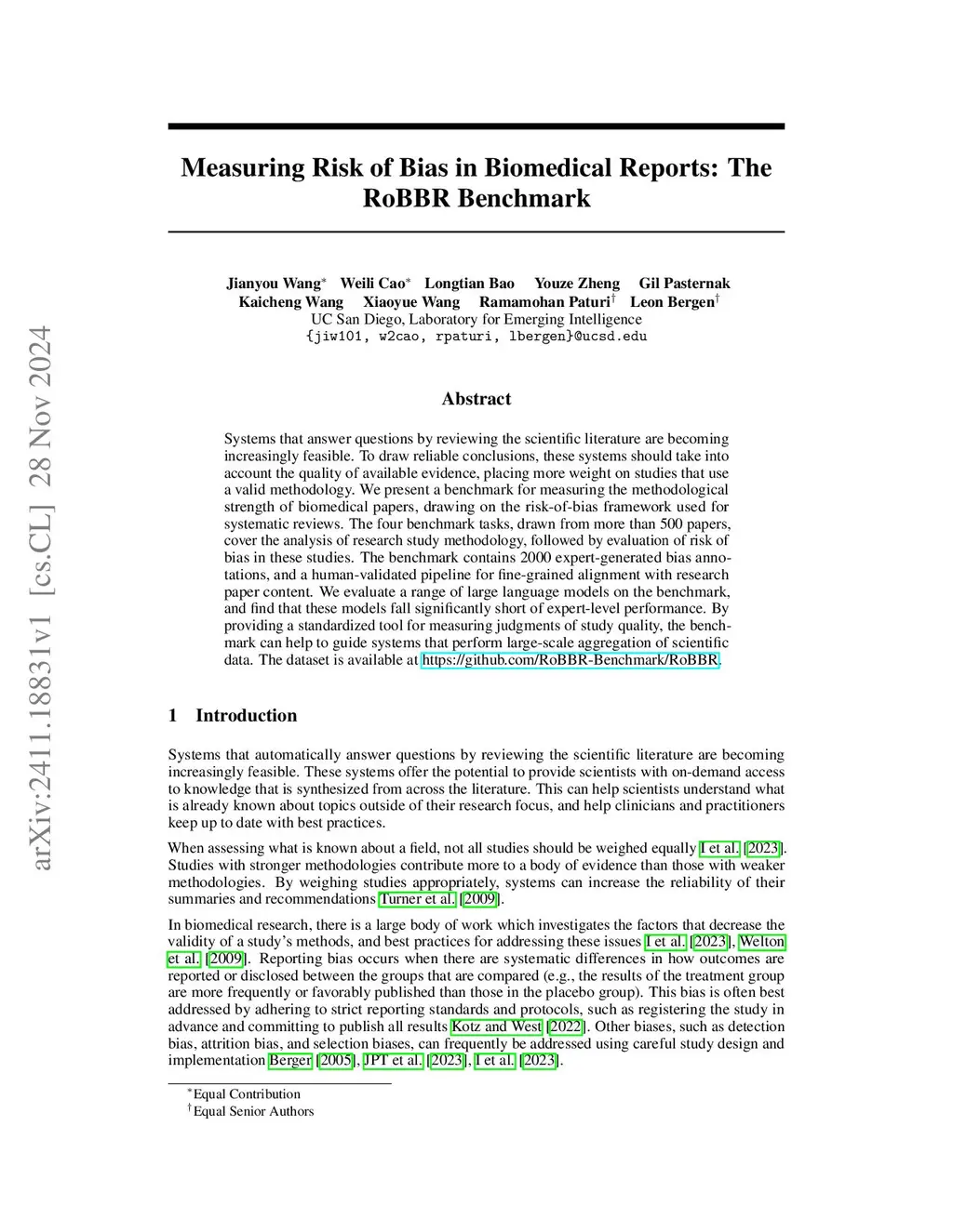 Measuring Risk of Bias in Biomedical Reports: The RoBBR Benchmark